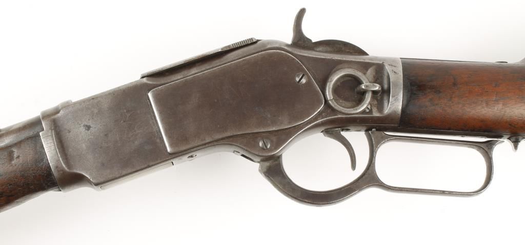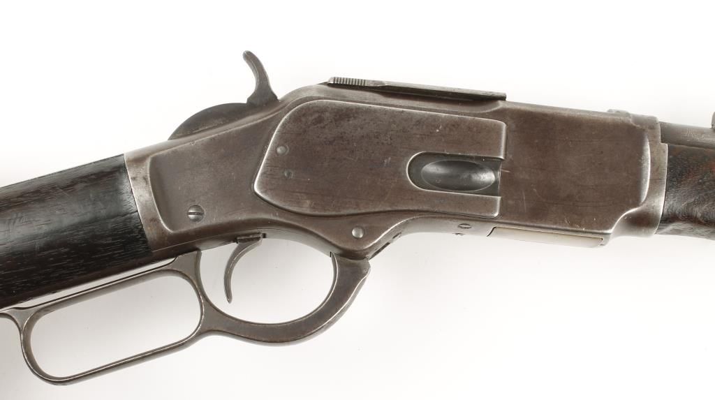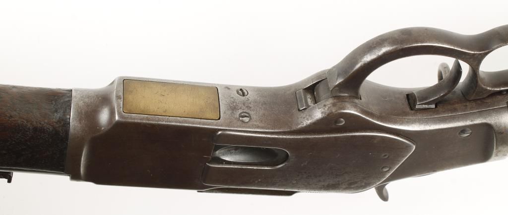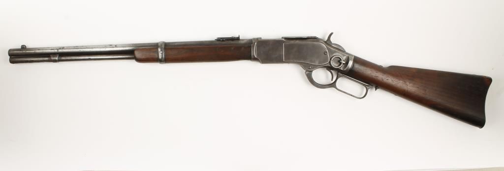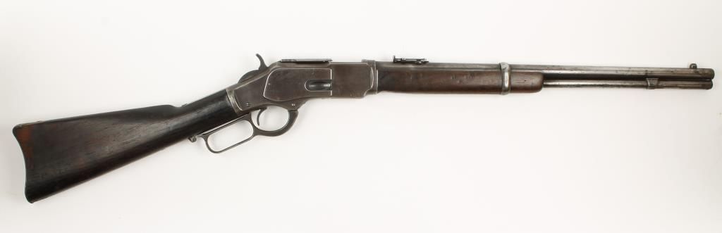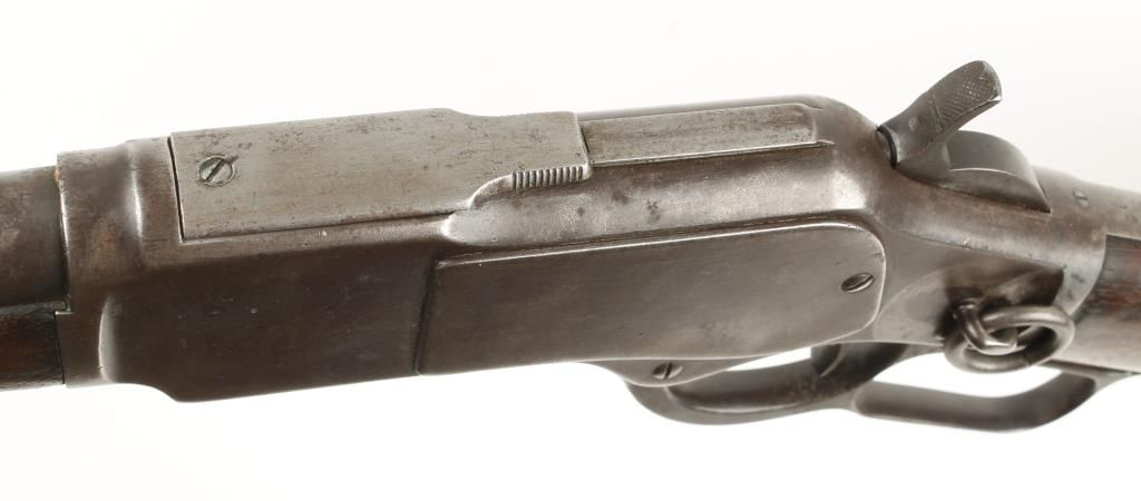 Lever action carbine made in 1901 with 20" round barrel. Blued finish, plain straight grip walnut stock and forearm, smooth steel buttplate, addle ring, flip up rear sight and full length tube magazine. Dark bore and fair action. Condition: Fair to good showing dark brown patina on receiver, traces of bluing on barrel and wood has darkened but is good