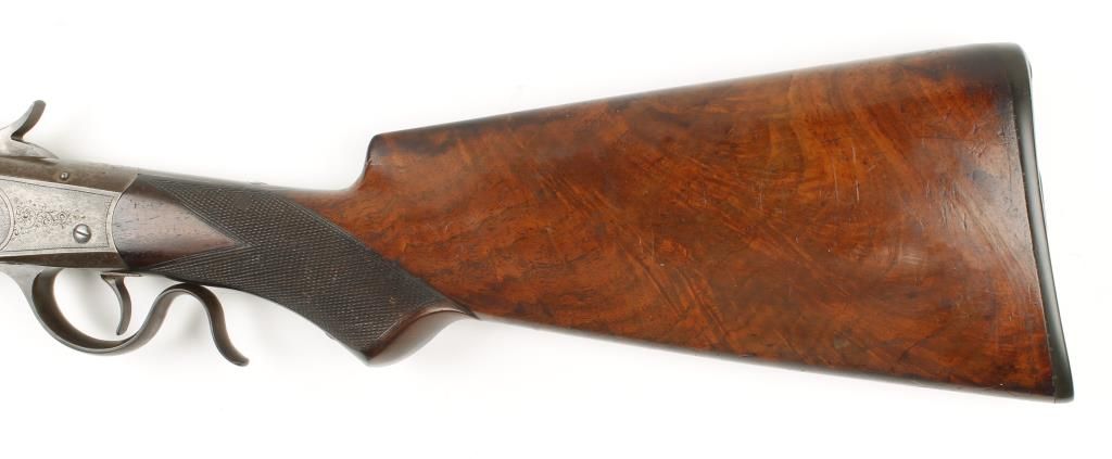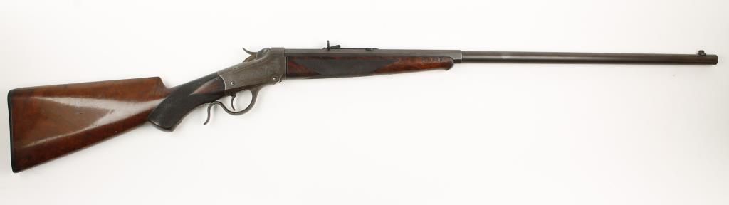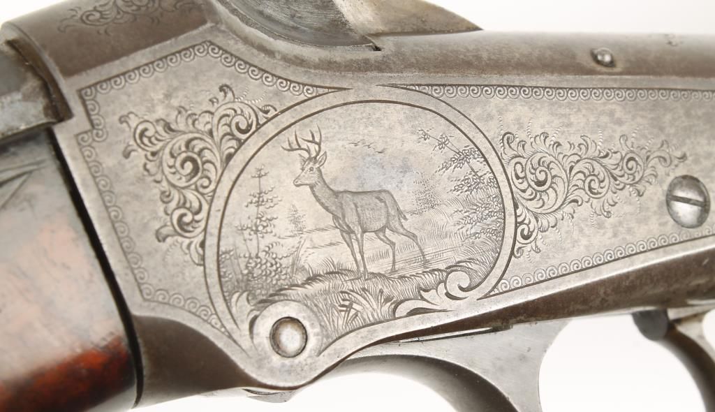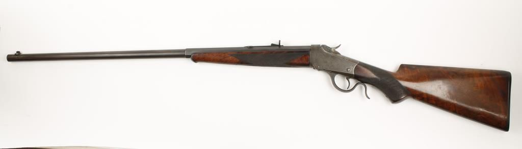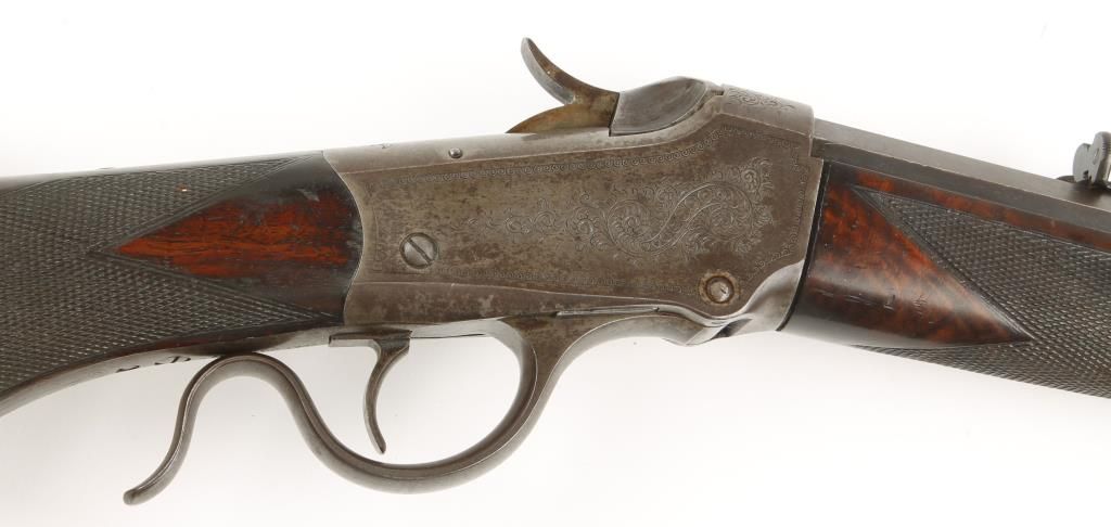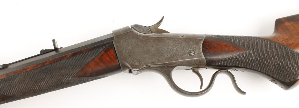 Single shot sporting Low Wall rifle made in 1889 with blued 28" part octagon part round barrel. Beautiful checkered pistol grip select walnut stock and forearm, shotgun style butt plate and open sights. Factory engraved receiver, left side shows image of a deer in an oval with scroll engraving around it, left side scroll engraved. Very good bore and action. Condition: Excellent