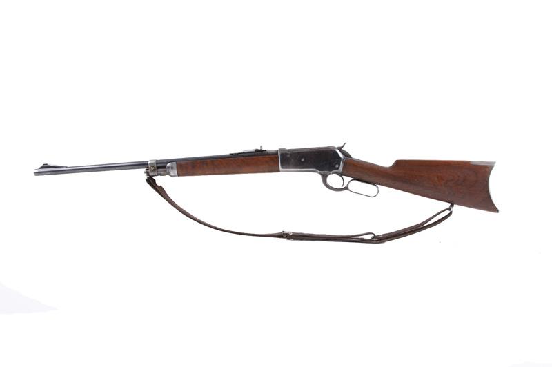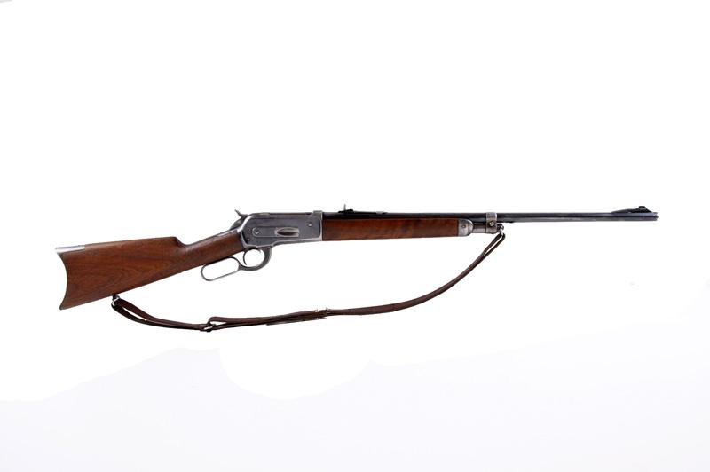 CondiNice lever action tube magazine rifle made in approx 1894. Blued finish, smooth walnut straight grip stock and fore arm, 24" round barrel, buckhorn rear sight, leather Red Head sling, good bore and action.Condition: Very good with repaired barrel band and some wear to finish particularly under the receiver which retains 80% of its blued finish. Nose cap has been stripped and so has the curved butt plate. Wood has been smoothed and reoiledand is in very good condition with only tiny chips at the receiver.