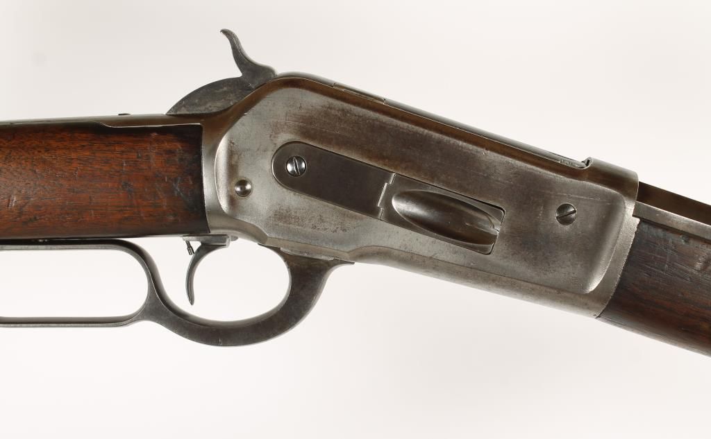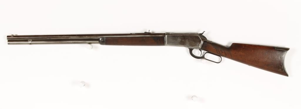 Lever action sporting rifle made in 1890 with 26" octagon barrel. Plain straight grip walnut stock and capped forearm, full length tube magazine, crescent butt plate and open sights. Good bore and action. Condition: Good overall showing traces of case coloring and 20% bluing which has turned to brown patina. Wood is good showing plugged hole on bottom of butt stock. *Antique Firearm*