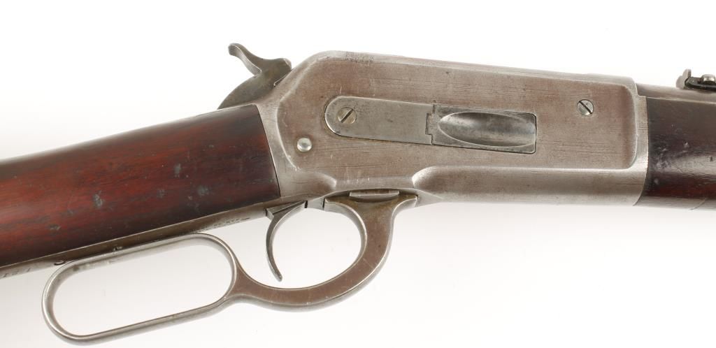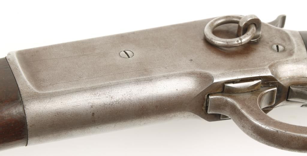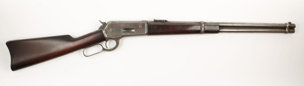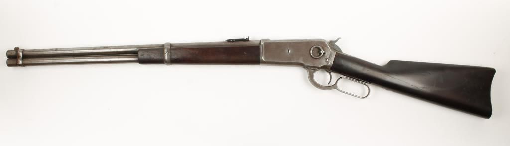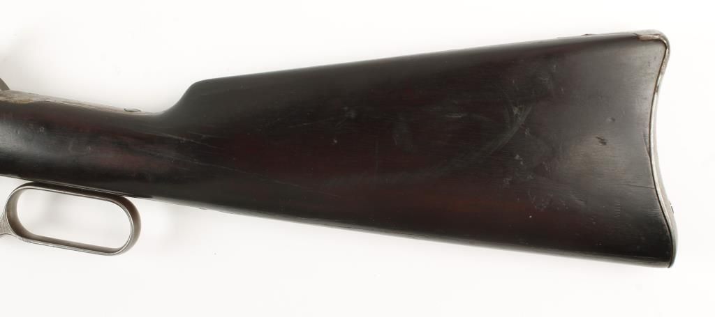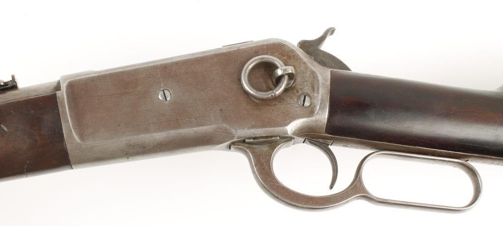 Lever action carbine made in 1900 with 22" round barrel. Plain straight grip walnut stock and forearm, steel buttplate, saddle ring, full length tube magazine and flip up rear sight. Very good bore and action. Condition: Good with little finish remaining,refinished stock showing signs of small cracks and light bruising.