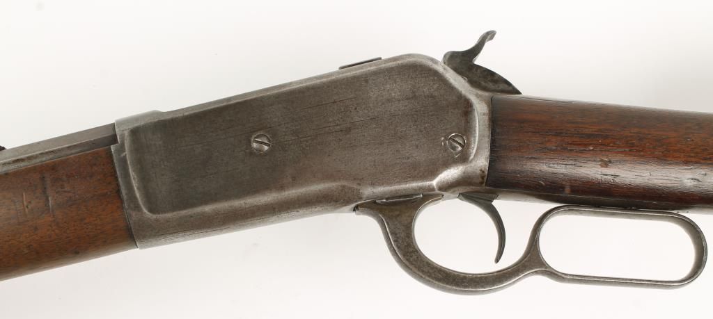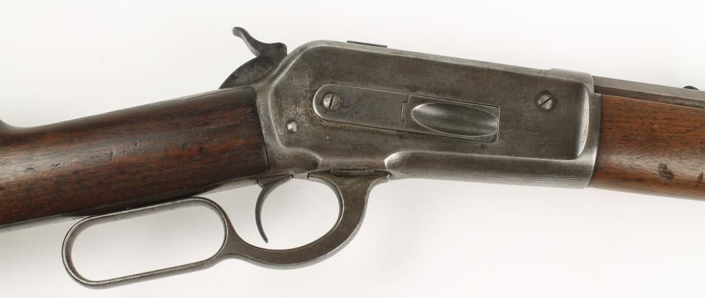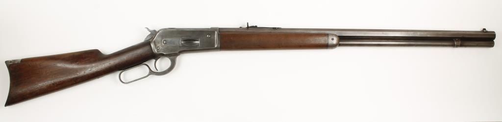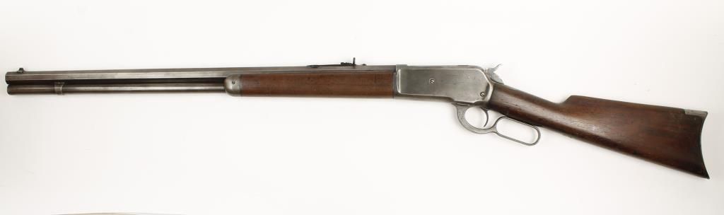 Lever action sporting rifle made in 1895 with 26" octagon barrel. Plain straight grip walnut stock and forearm, crescent butt plate, open sights and full length tube magazine. Good bore and action. Condition: Good showing traces of case color, faint bluing and wood is good.