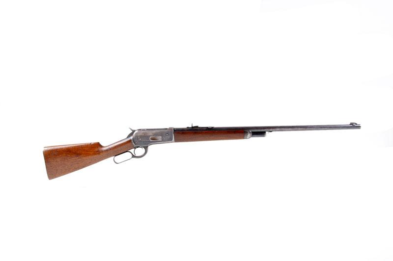 Winchester Mdl 1886 Cal .45-90 SN:133306 Lever action high power hunting rifle. Blued finish, case color lever and hammer, smooth walnut straight grip stock and forearm, 26" round barrel with buckhorn sight and 1/2 length magazine, good bore and action.Lever action high power hunting rifle. Blued finish, case color lever and hammer, smooth walnut straight grip stock and forearm, 26" round barrel with buckhorn sight and 1/2 length magazine, good bore and action.Condition: Very good to fine with about 1/4 of the blue rubbed off the receiver from field carry. Case colors mostly visible in protected areas. 50% of finish remains on the steel butt plate. Wood is above average and appears original to the gunbut does exhibits many small dings and small scratches from field use.