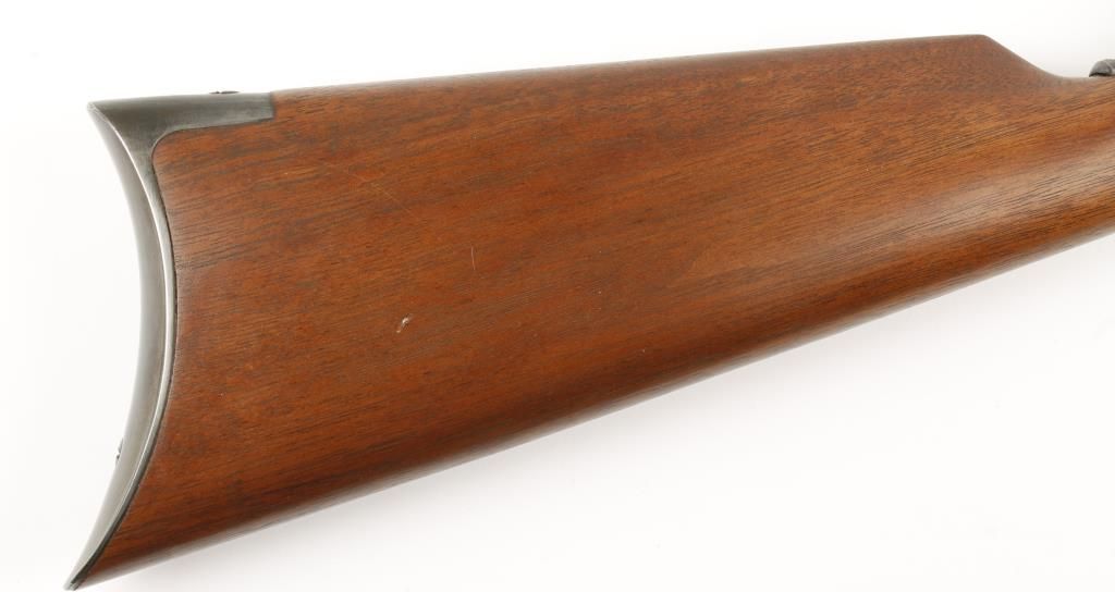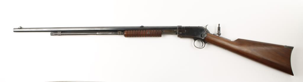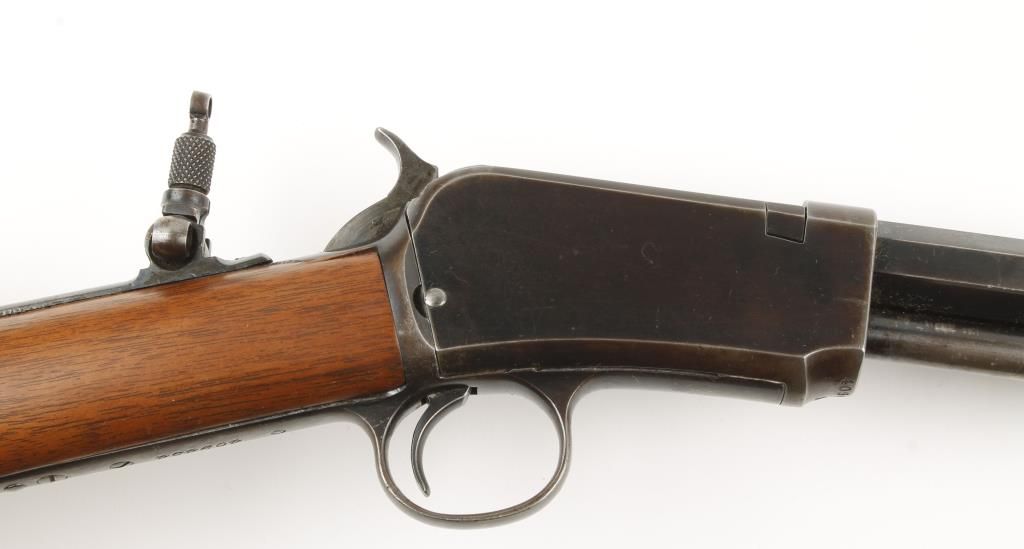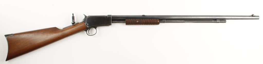 Pump action take down rimfire rifle made in 1910 with 24" octagon barrel. Blued finish, plain straight grip walnut stock with grooved pump handle, crescent butt plate and tube magazine. Fitted with tang peep sight. Good bore and action. Condition: Good showing thinning bluing and slide wear.