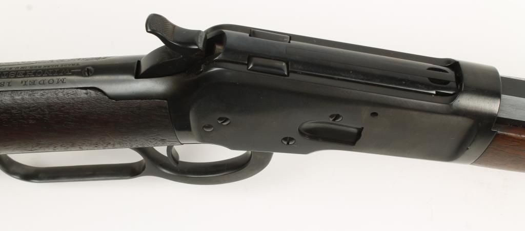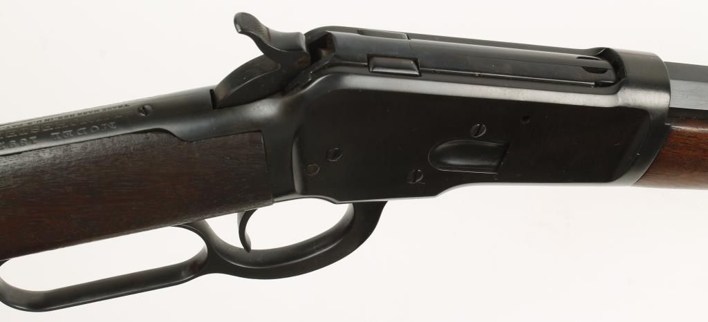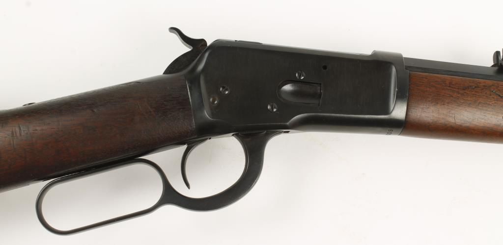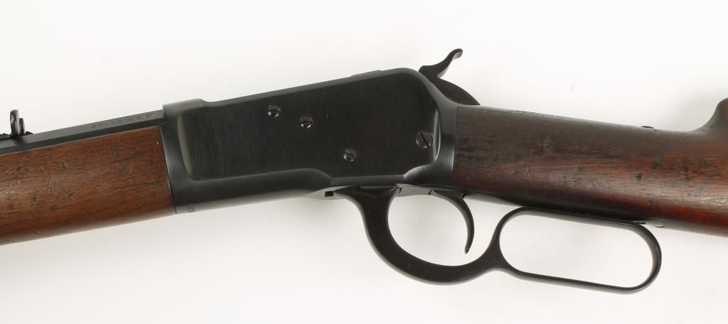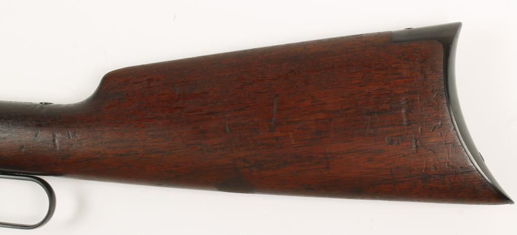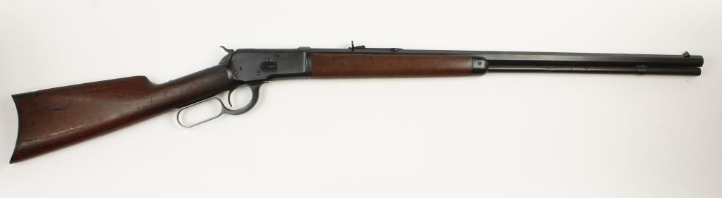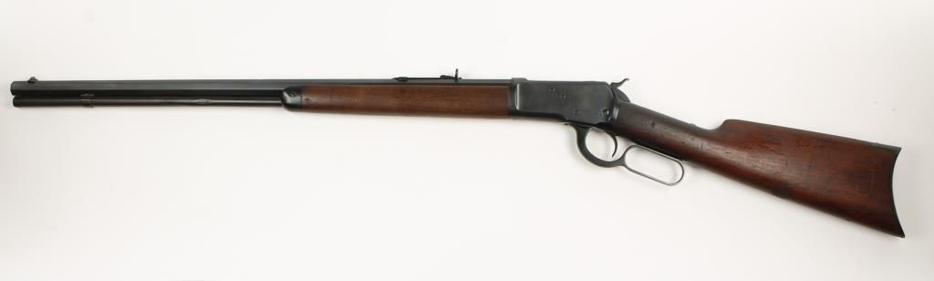 Lever action sporting rifle made in 1911 with 24" octagon barrel. Blued finish, plain straight grip walnut stock, capped forearm, crescent butt plate and full length tube magazine. Dark bore and good action. Condition: Good to very good showing damage to magazine tube, wood is lightly bruised.