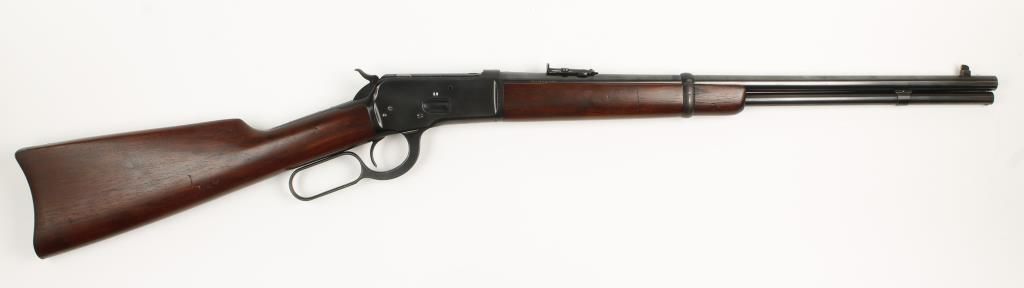 Lever action carbine made in 1926 with 20" round barrel. Reblued finish, plain straight grip walnut stock and forearm, steel butt plate, full length tube magazine, saddle ring and flip up rear sight. Very good bore and action. Condition: Good as refinished
