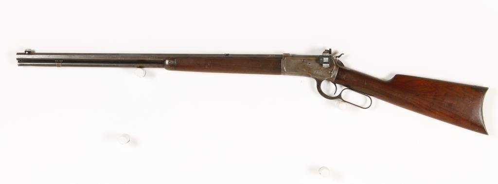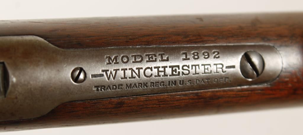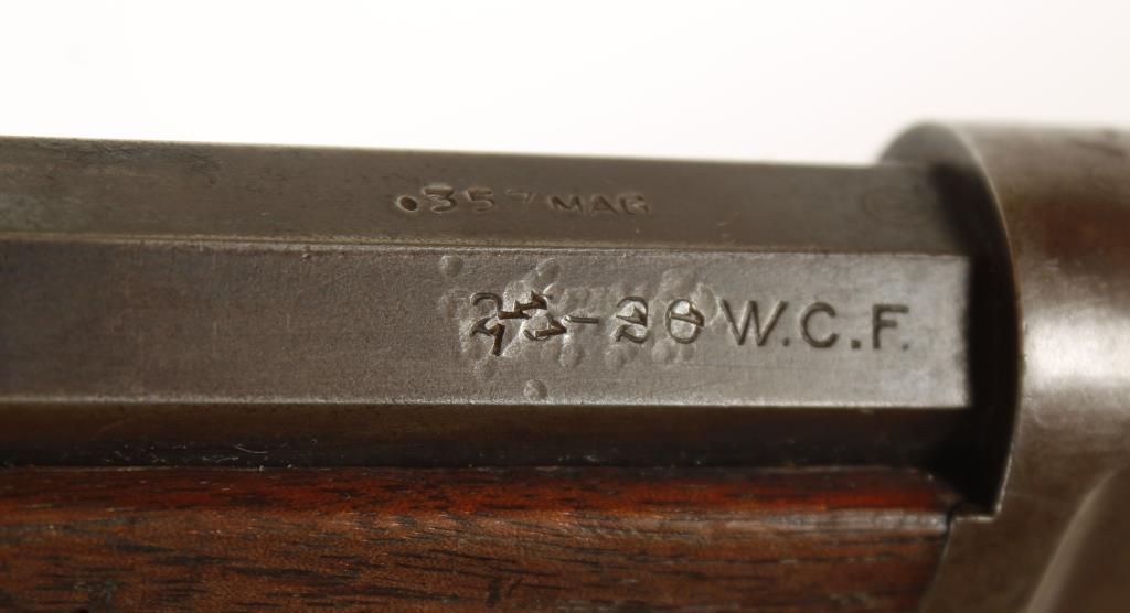 Lever action rifle rechambered in .357 Magnum with 24" octagon barrel. Plain straight grip walnut stock and forend, crescent butt plate full length tube magazine, and fitted with receiver mount Redfield peep sight. Very good bore and action. Condition: Fair to good showing thin bluing which has turned to brown patina. Wood shows minor losses. *Curio & Relic Firearm*