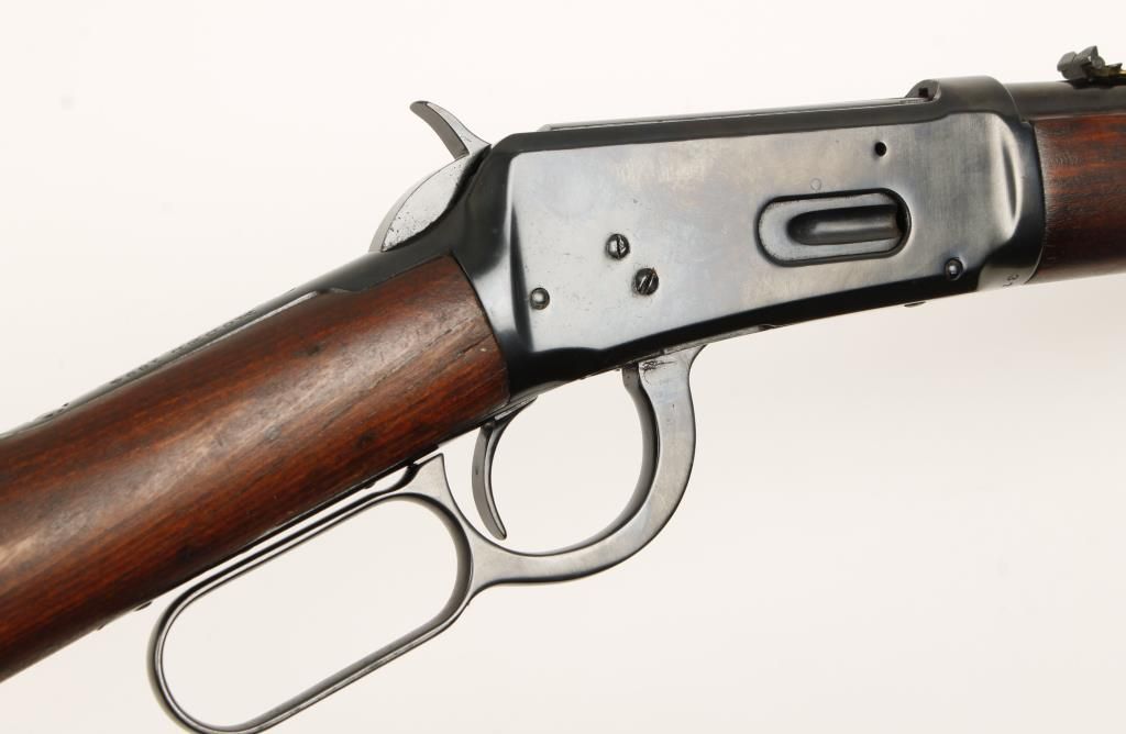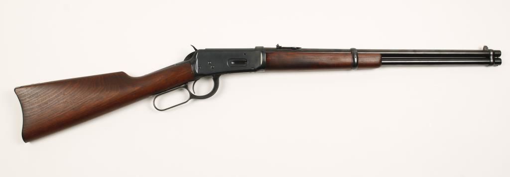 Popular lever action carbine made in 1906 with 20" barrel. Early reblued finish, plain straight grip walnut stock and forend, saddle ring, full length tube magazine and leaf rear sight. Good bore and action. Condition: Very good as refinished with very good metal to wood fit *Curio & Relic Firearm*