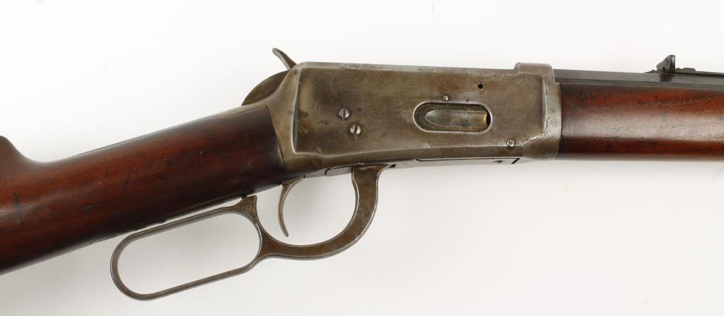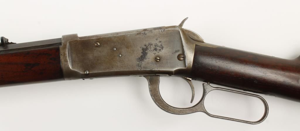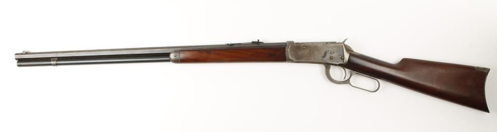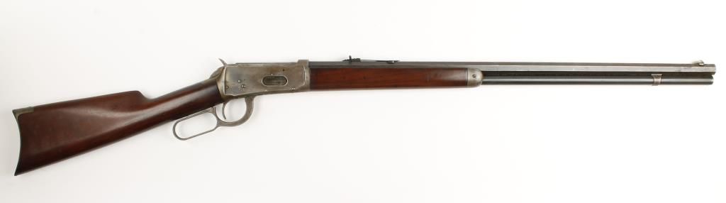 Lever action sporting rifle made in 1902 with 26" octagon barrel. Blued finish, plain straight grip walnut stock and capped forearm, crescent butt plate and full length tube magazine. Good bore and action. Condition: Good overall showing 20% finish remaining on receiver. Wood is good.