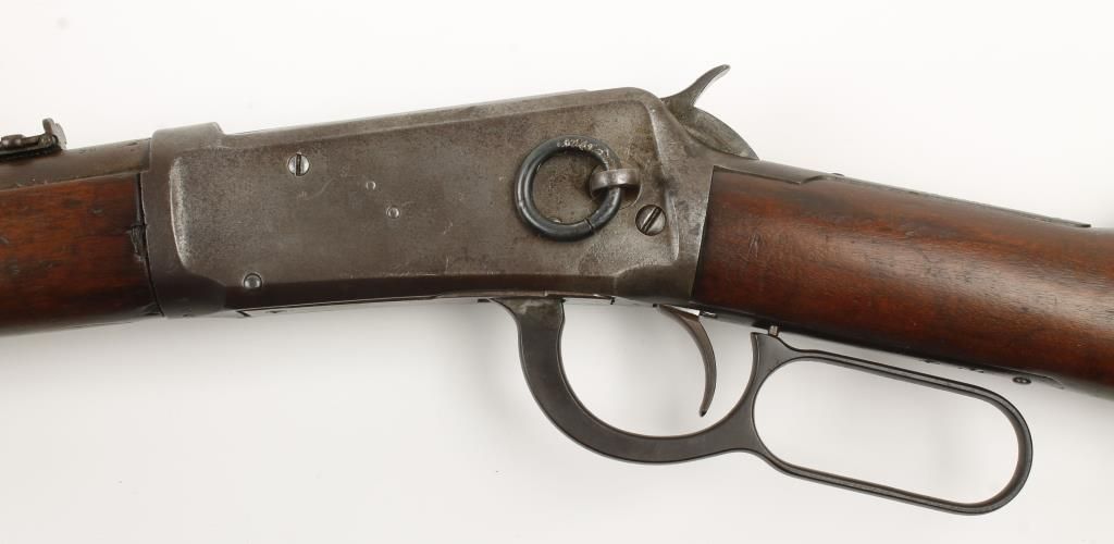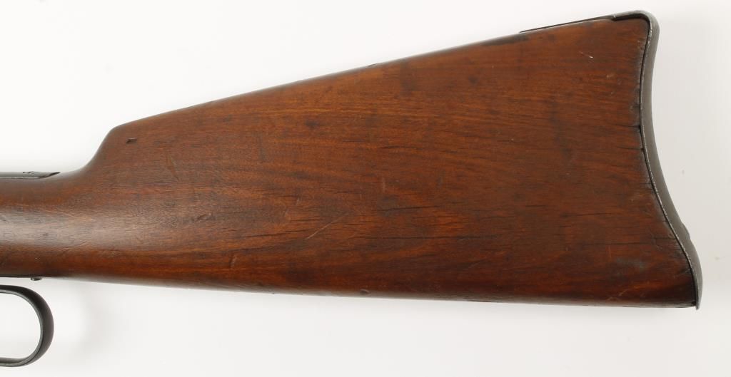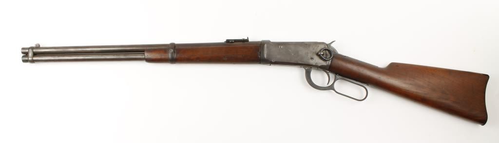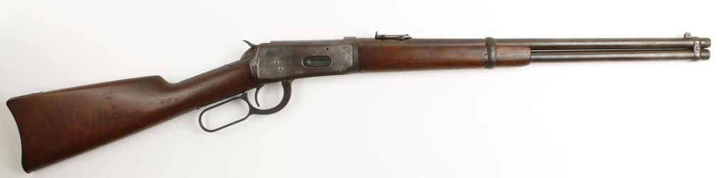 Lever action carbine made in 1907 with 20" round barrel. Blued finish, plan straight grip walnut sock and forearm, tube magazine, steel butt plate, flip up rear sight and saddle ring. Good bore and action. Condition: Fair to good showing light pitting and traces of original bluing.
