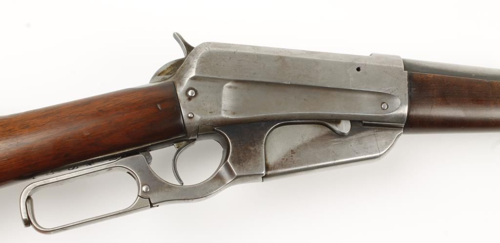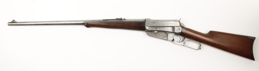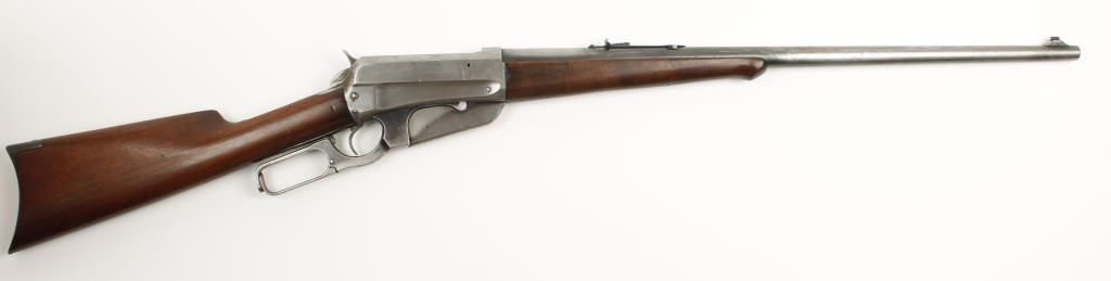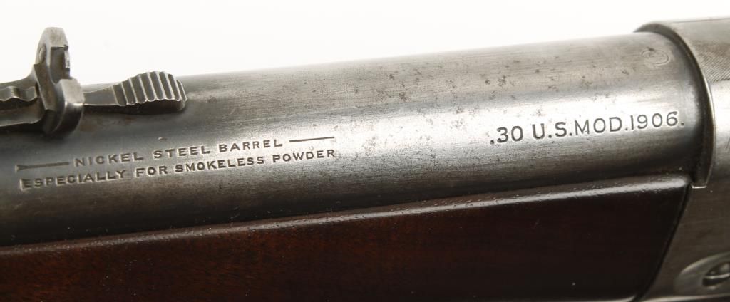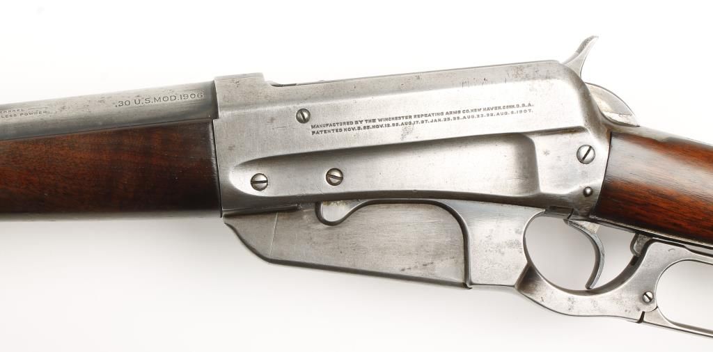 Lever action rifle made in 1912 with 24" barrel. Barrel stamped ".30 U.S. Mod. 1906", straight grip walnut stock and forearm and crescent buttplate. Good bore and action. Condition: Good showing traces of bluing. Light refinish on stock.