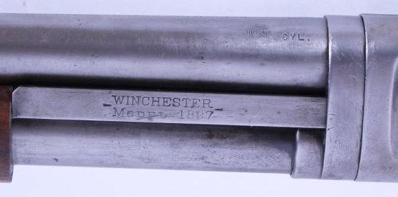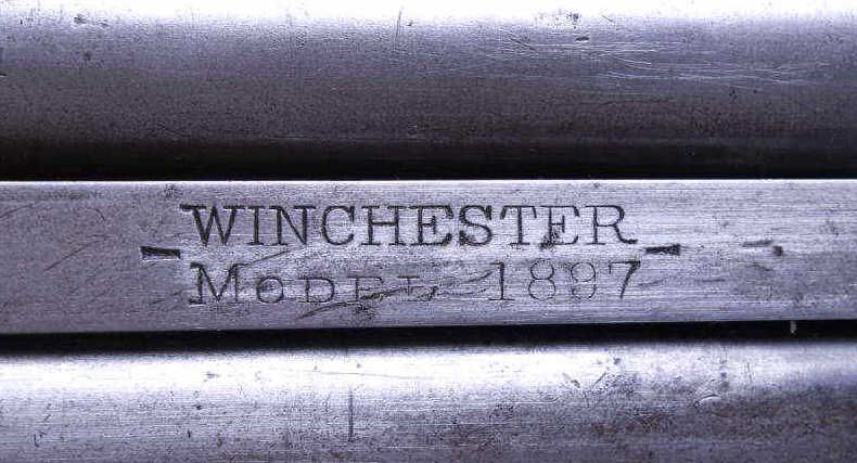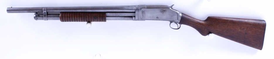 Winchester Mdl 1897 12 ga SN:242514US Military pump action take down shotgun, 20" barrel, "US" stamped, plain pistol grip wood stock, good cartouche, used during WWII in the trenches, no barrel hand guard or bayonet, good bore and action.Condition: Overall fair to good with no finish remaining, dings and scratches on wood and receiver.