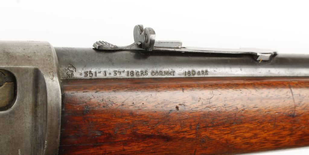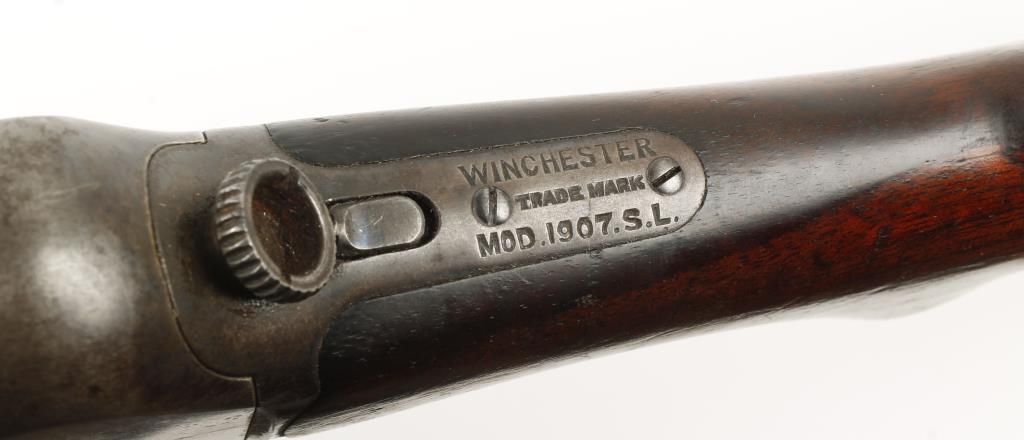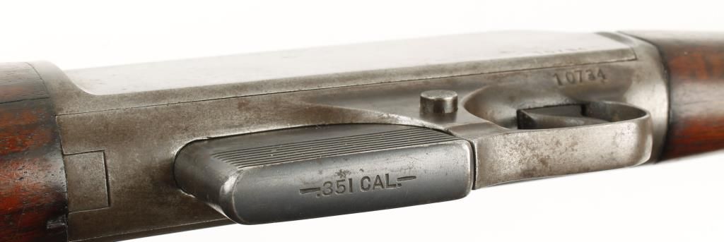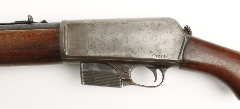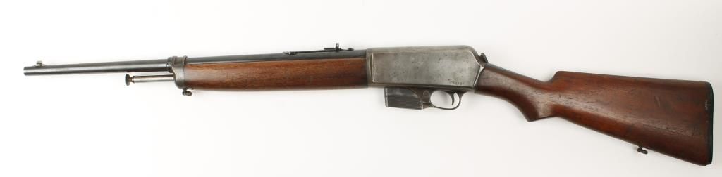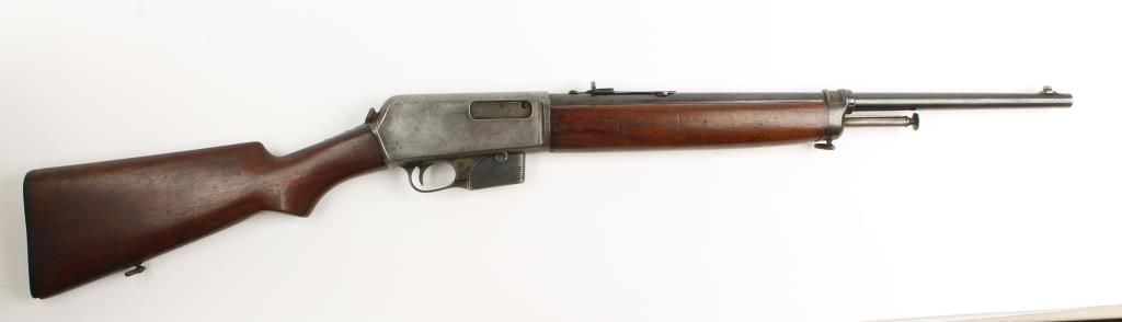 Early Semi auto rifle made in 1908 with 20" round barrel. Blued finish, plain pistol grip walnut stock and forearm, open sights and sling swivels. Good bore and action. Includes 1 magazine. Condition: Good overall showing only traces of original blue on receiver, with small chip in plastic butt plate.
