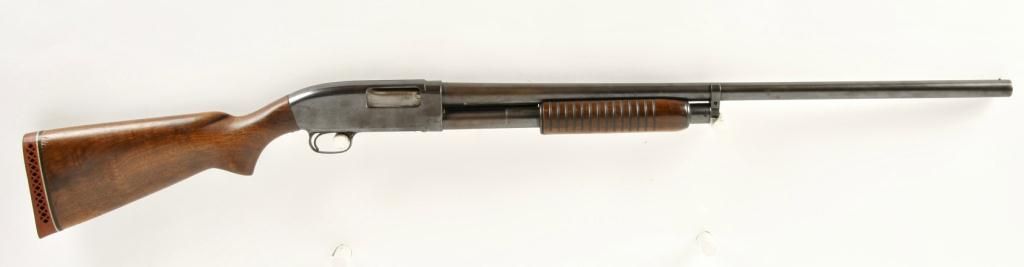 Winchester Mdl 25 12 ga SN:40117Solid frame pump action shotgun, blued finish with plain pistol gri