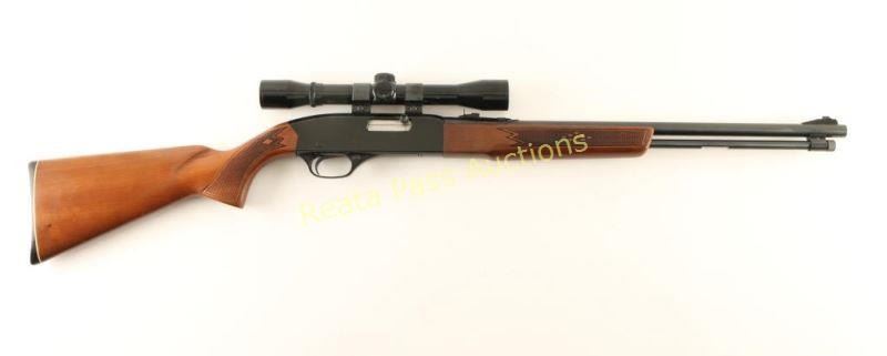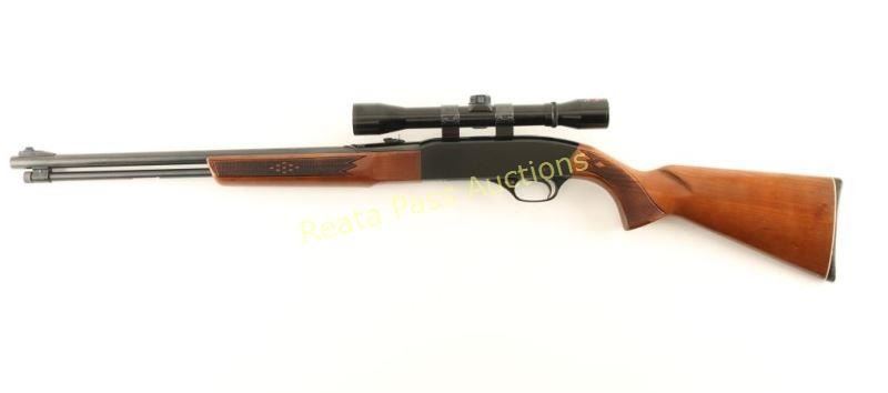 Tube fed semi-automatic sporting rifle chambered for .22 Short, Long or Long Rifle, circa 1965-1973. Features a blued/black finish, 20.5" 'JM' marked barrel, full-length tube magazine, ramped blade front sight with silver bead, adjustable rear sporting sight, Hurricane Horizon 4x 32mm scope, push button safety, beveled trigger, alloy frame, jeweled bolt, press checkered walnut forend and pistol grip shoulder stock with factory back hard rubber buttplate. Rifle exhibits approximately 97% of it's original finish intact with a large scratch and few small scratches observed on the receiver. Action performs well, bore is excellent and wood stocks are fine. Condition is near excellent. ***Modern Firearm***