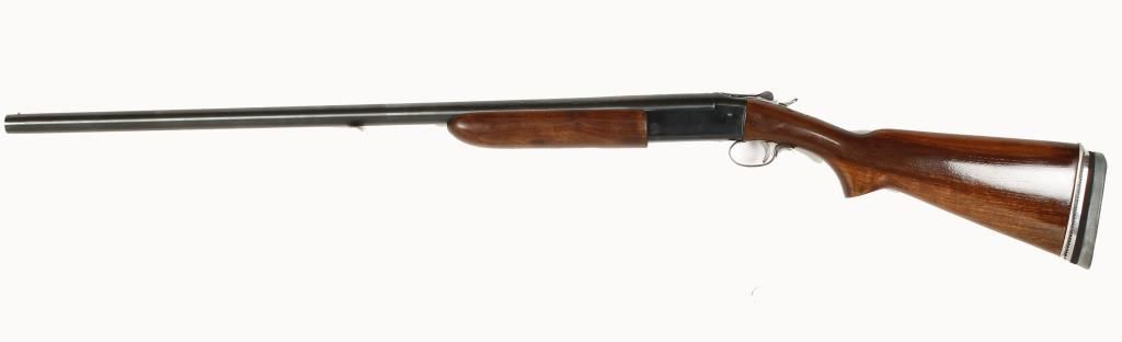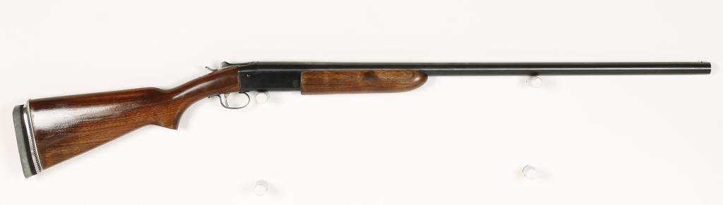 Single shot break action exposed hammer shotgun with 30" barrel chambered for 2-3/4" shells. Blued finish, plain pistol grip wood stock and forearm. Stock has been fitted with adjustable butt pad. Very good bore and action. Condition: Good showing small chip repair near trigger with possible wood refinish. Metal parts are very good.