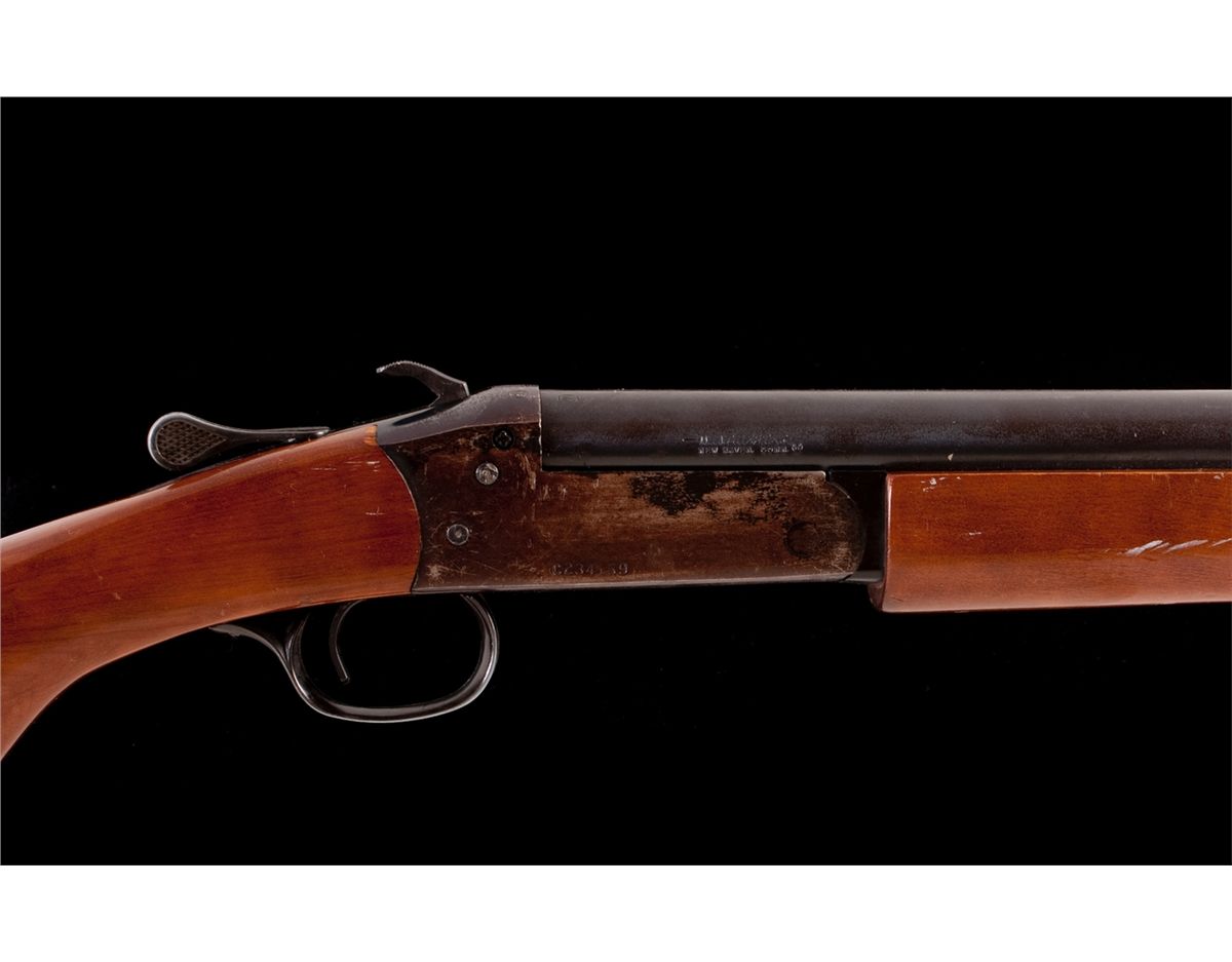 Single shot break action shotgun made in Canada with 30" barrel, blued finish, plain wood stock and forearm, exposed hammer, good bore and action.