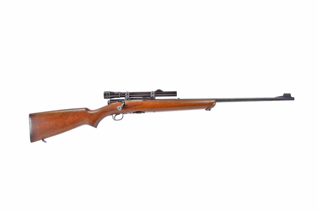 Winchester Mdl 43 Cal .22 Hornet SN:13117 Early bolt action smaller caliber hunting rifle with box magazine. Blued barrel & action, walnut smooth semi-pistol grips stock with steel butt plate, 24" barrel with Kollmorgan Optics scope on a Redfield mouEarly bolt action smaller caliber hunting rifle with box magazine. Blued barrel & action, walnut smooth semi-pistol grips stock with steel butt plate, 24" barrel with Kollmorgan Optics scope on a Redfield mount, sling swivels, good bore andaction. Condition: Very good to excellent with a very few mars to the stock. Rear sight removed with a Marbles filler installed, hooded front sight still intact.
