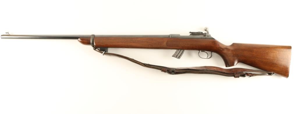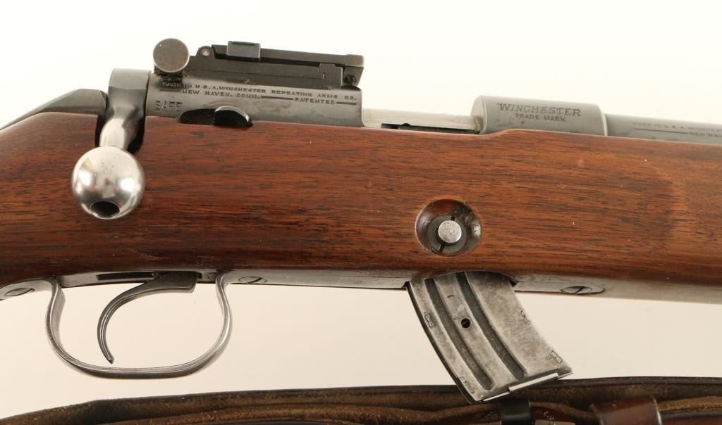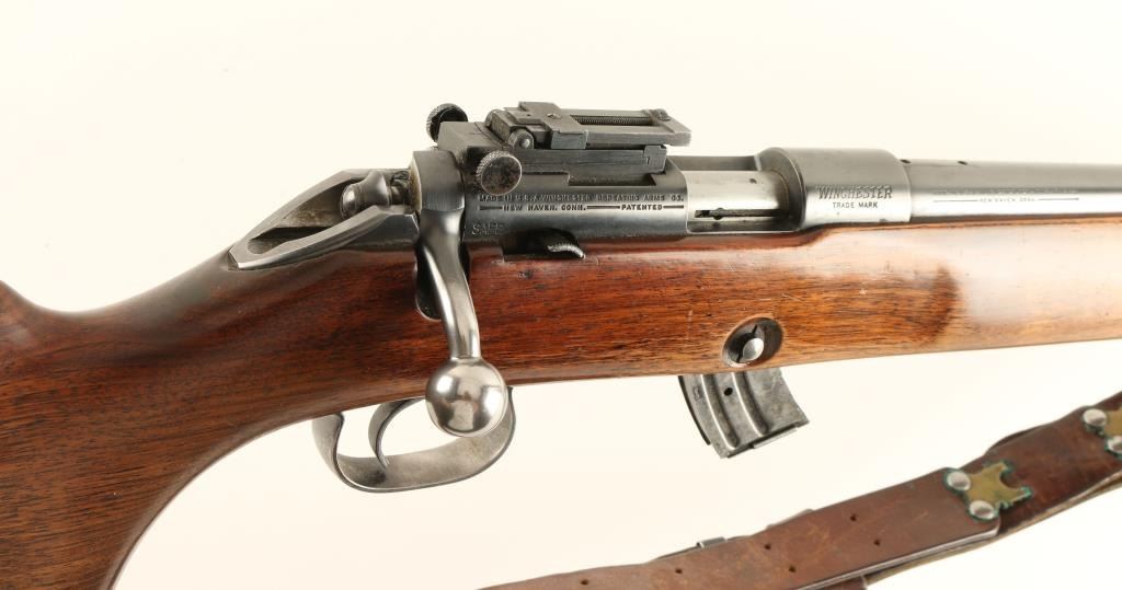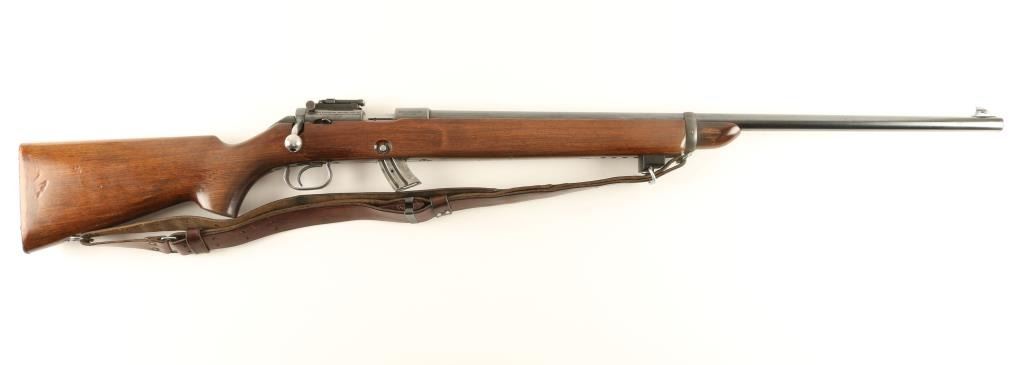Excellent quality magazine fed bolt action target rifle chambered in .22 Long Rifle, circa 1941. Regarded as one of the finest small-caliber rifles ever built. Features a blued finish, 28" heavy barrel drilled and tapped for scope blocks, ramped blade front sight, adjustable aperture sight on receiver, serrated trigger, factory magazine, manual safety, smooth brown leather sling, barrel band, checkered metal buttplate and one piece walnut pistol grip shoulder stock with flush mounted accessory rail in forend. Rifle exhibits approximately 94% finish which may be an expert refinish as some of the markings are less than crisp. Action is smooth, bore is excellent, and wood stock is near fine. Condition is near excellent. ***C&R Firearm*** ***Modern Firearm***