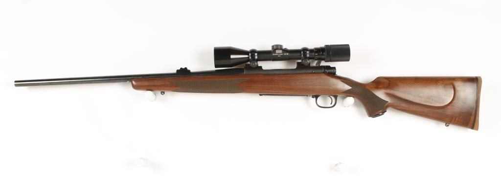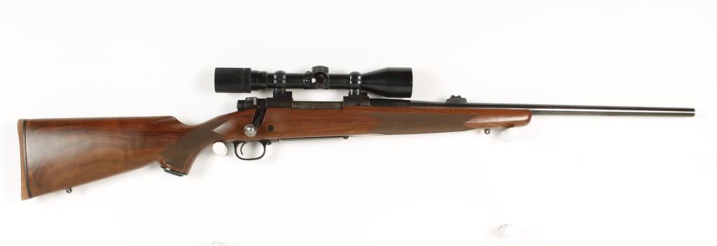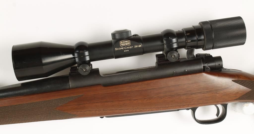 Bolt action sporting rifle with 22" barrel. Blued finish, checkered pistol grip walnut stock, red rubber butt plate, sights have been removed and fitted with Bushnell Scope Chief 3-9X scope. Very good bore and action. Condition: Very good showing very light use. *Modern Firearm*