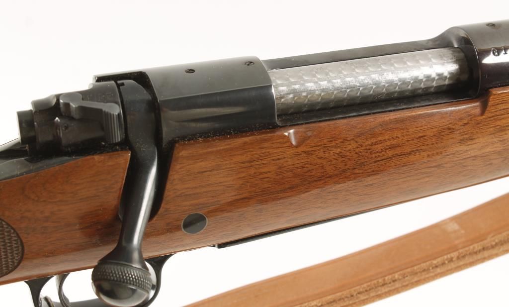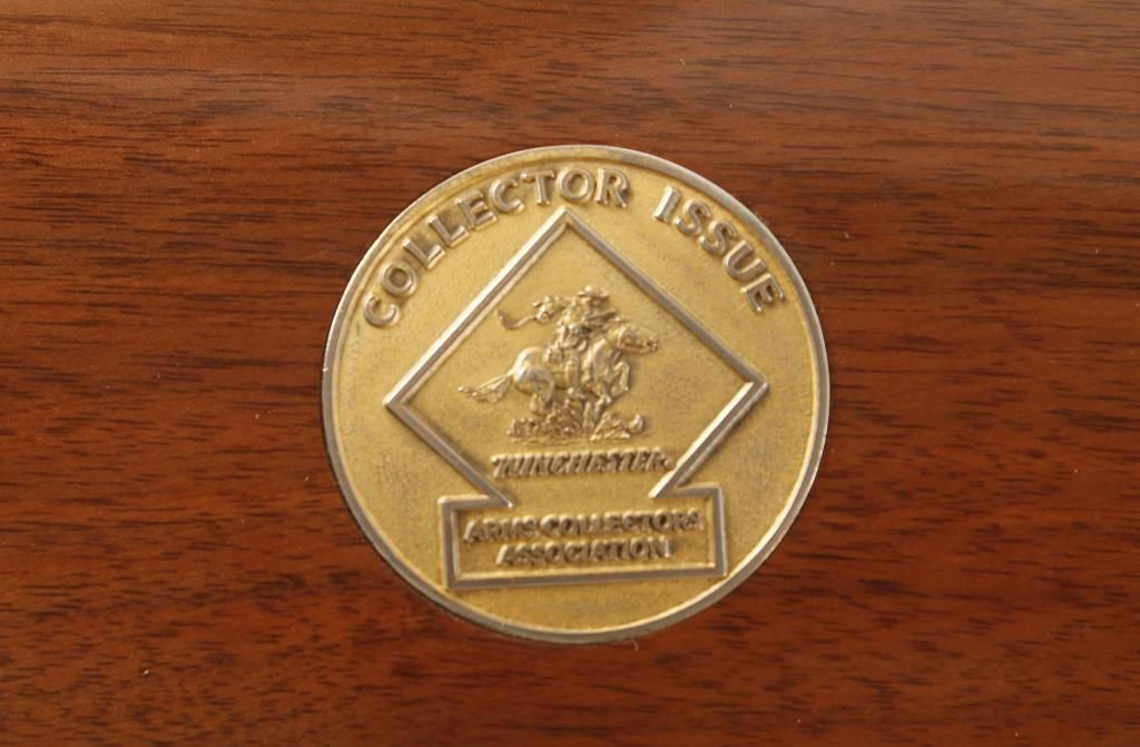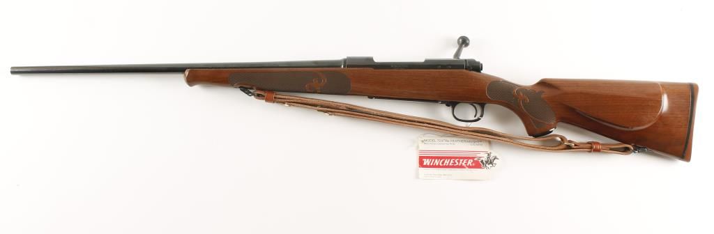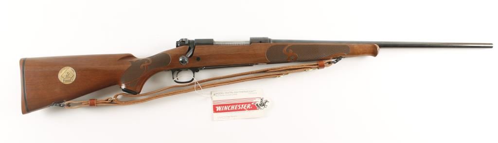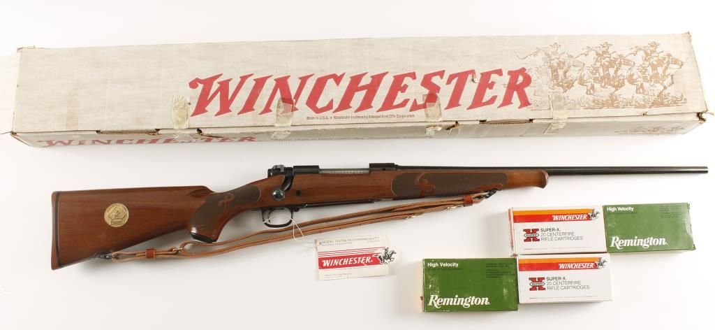 Bolt action Super Grade Collector issue featherweight rifle with 22" barrel. Blued finish, fancy checkered pistol grip walnut stock with schnabel forend, jeweled bolt, red rubber butt plate, no sights and factory drilled and tapped for scope. Right side of butt stock has gold medallion inlaid with "Collector Issue Arms Collector Association". Excellent bore and action. Still retains hang tag. Includes original box and papers, 39 rounds of Winchester Super-X and 39 rounds of Remington ammo. Condition: Near perfect. *Modern Firearm*
