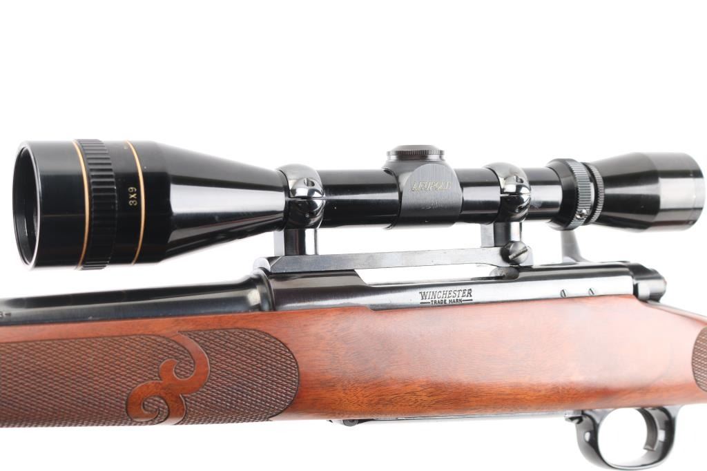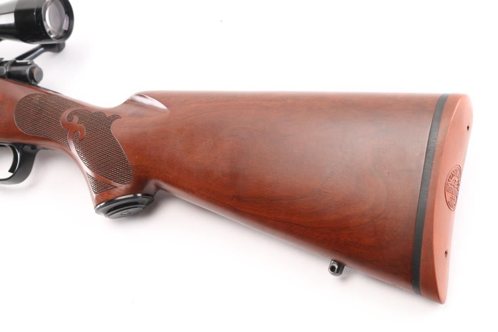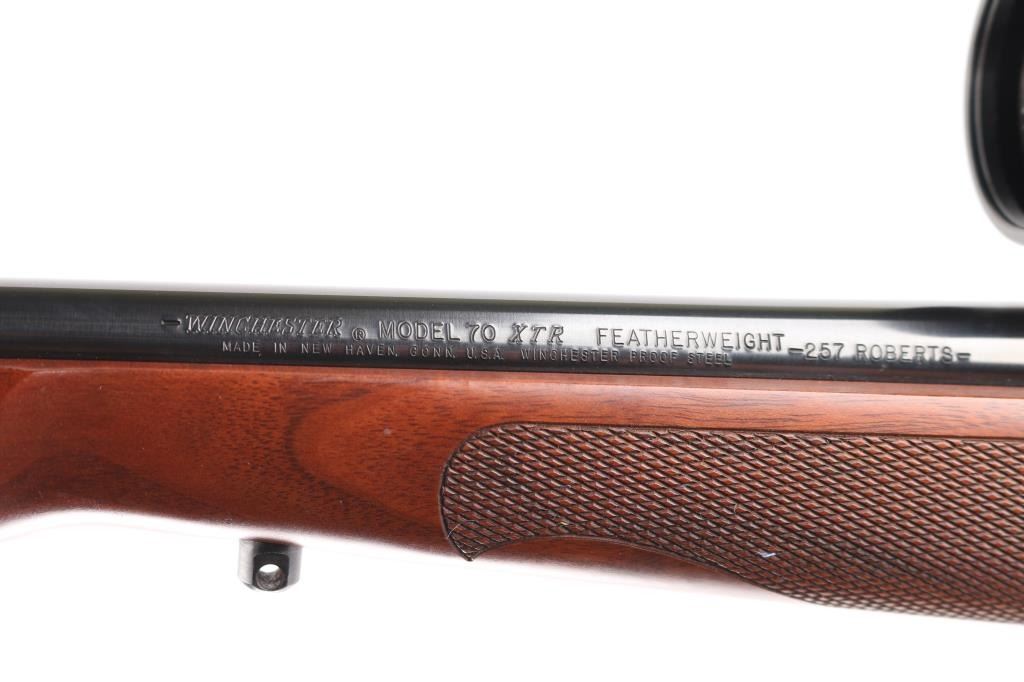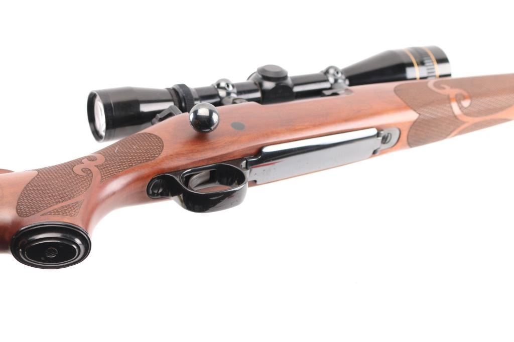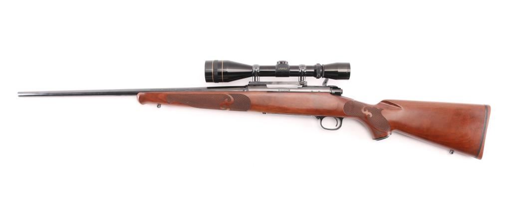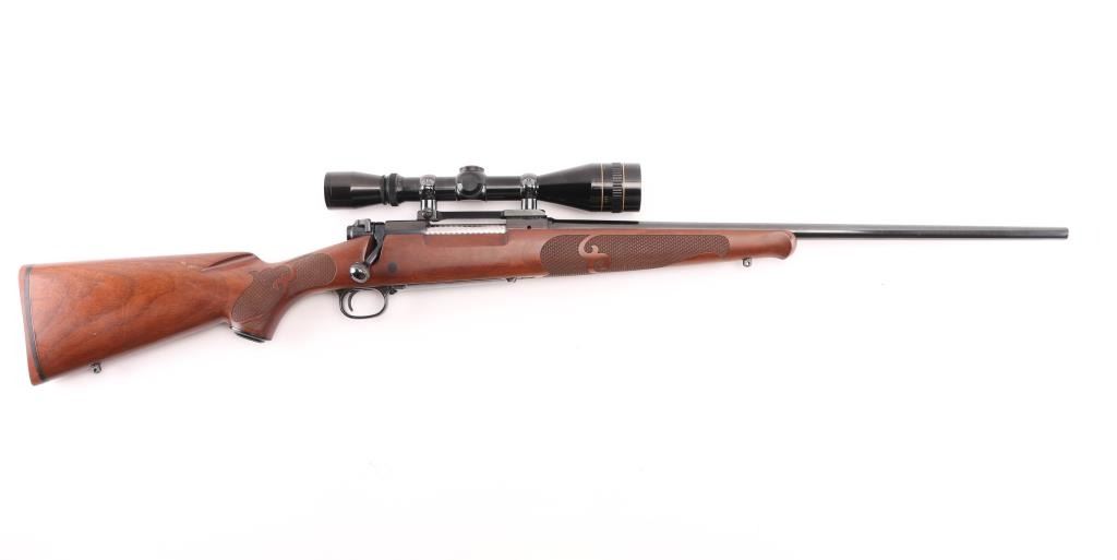 Caliber .257 Roberts SN: G1511303. Light weight bolt action sporting rifle. Features a blued finish, 22" tapered barrel with no provisions for sights, installed Leupold one-piece scope base with rings, Leupold 3x9 scope, clear optics. serrated trigger, jeweled bolt, three position safety on the rear of the bolt, internal box magazine with hinged floorplate, and fancy checkered pistol grip walnut shoulder stock with schnabel forend, grip cap, Factory red recoil pad & 13 1/2" LOP. Rifle exhibits approximately 99% of it's original blued finish showing very little wear. Action is smooth, the bore is pristine, and the wood stock is fine. NRA Condition-Excellent. Modern Firearm.