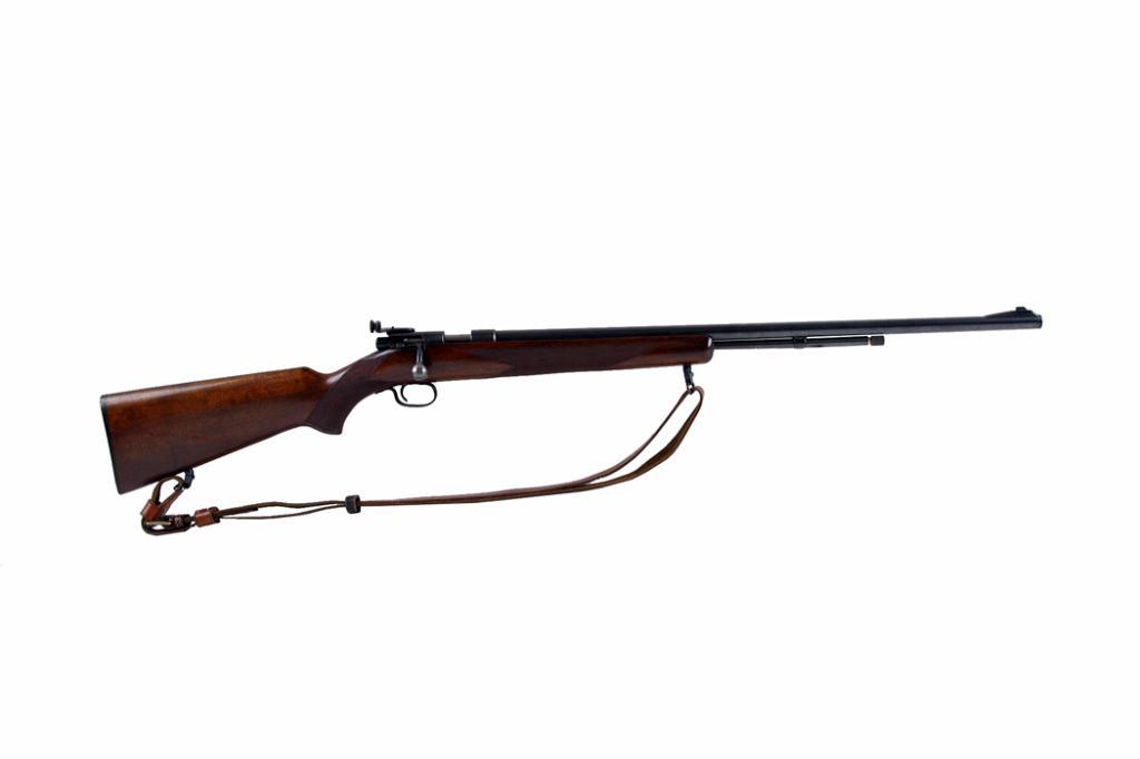 Winchester Mdl 72 Cal .22S,L,LR SN:NVSN Bolt action .22 target rifle with tube magazine. Blued finish, checkered semi pistol stock with plastic butt plate and leather sling installed, 24" barrel with standard ramp front sight and rear receiver mounted peBolt action .22 target rifle with tube magazine. Blued finish, checkered semi pistol stock with plastic butt plate and leather sling installed, 24" barrel with standard ramp front sight and rear receiver mounted peep sight, good bore andaction. Condition: Excellent with little sign of use. Just a few storage dents.