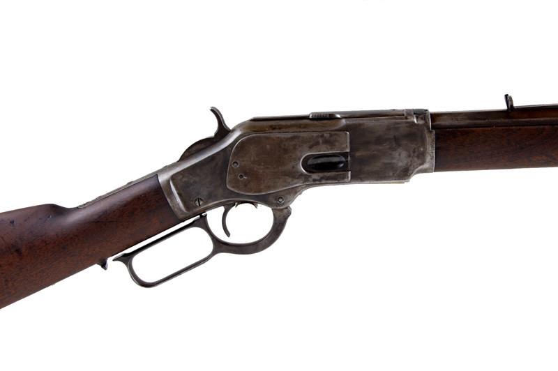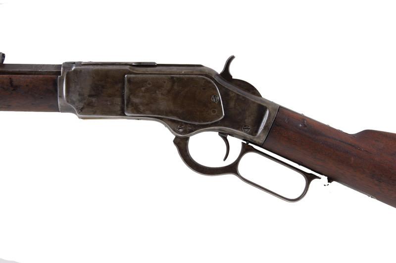 Winchester Mdl 73 Cal .38WCF SN:410599B Lever action hunting rifle. 23" octagonal barrel shows mostly brown patina, receiver shows what appears to be a cold blued finish, button magazine is special order item, straight grip wood stock with curved butt plLever action hunting rifle. 23" octagonal barrel shows mostly brown patina, receiver shows what appears to be a cold blued finish, button magazine is special order item, straight grip wood stock with curved butt plate and smooth wood forearmwith metal cap, bore is fair but may clean, action does not hold full cock and needs some adjustment, standard rifle sights but rear sight is missing adjuster . Condition: Good as refinished. Barrel may havebeen reworked. Wood has been smoothed.