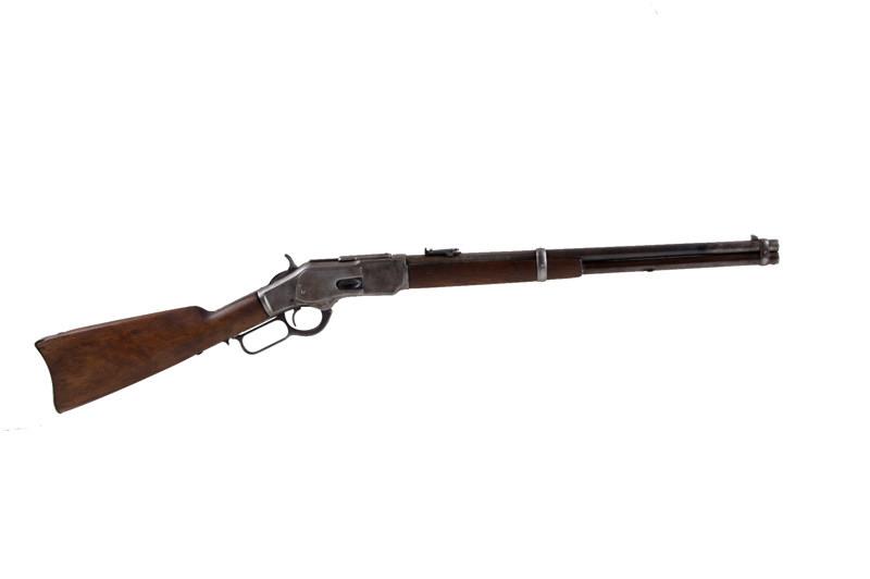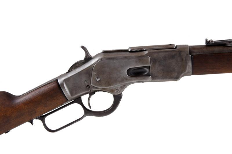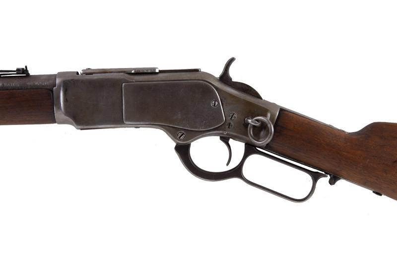 Winchester Mdl 73 SRC Cal .44WCF SN:63463 C.M. Bates rework of a lever action carbine from the 1880s. Blued finish, smooth straight grip stock and forearm, 19 1/2" round barrel with full length magazine and 1 barrel band, adjustable ladder style sight, sC.M. Bates rework of a lever action carbine from the 1880s. Blued finish, smooth straight grip stock and forearm, 19 1/2" round barrel with full length magazine and 1 barrel band, adjustable ladder style sight, saddle ring is still there,good bore and working action. Condition: Good to very good as refinished. Stock has been reduced in size during refinish and doesn't fit well but could be replaced. Barrel shows some erosion along the top of the forearm.