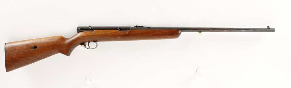 Winchester Mdl 74 Cal .22LR SN:204489ASemi automatic tube magazine rifle, magazine in buttstock, blued steel 22" barrel/receiver/trigger guard/buttplate, iron sights with rear sight elevation adjustment, 1 piece plain wood stock, bluing loss onbarrel from wear, bluing loss on receiver at edges, very good bore and action. Condition: Very good.