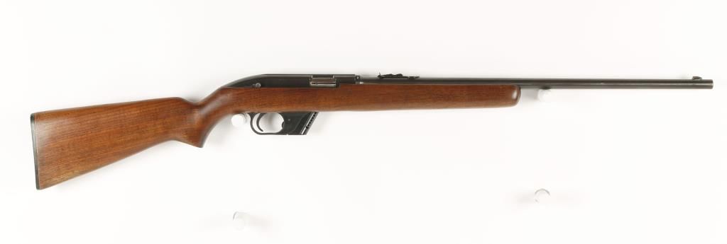 Semi auto rimfire rifle with 22" round barrel and detachable box magazine. Blued finish, plain pistol grip wood stock, nylon trigger guard, and open sights. Very good bore and action. Includes 1 magazine. Condition: Very good showing light scratching and very light pinpricking. *CURIO & RELIC FIREARM*