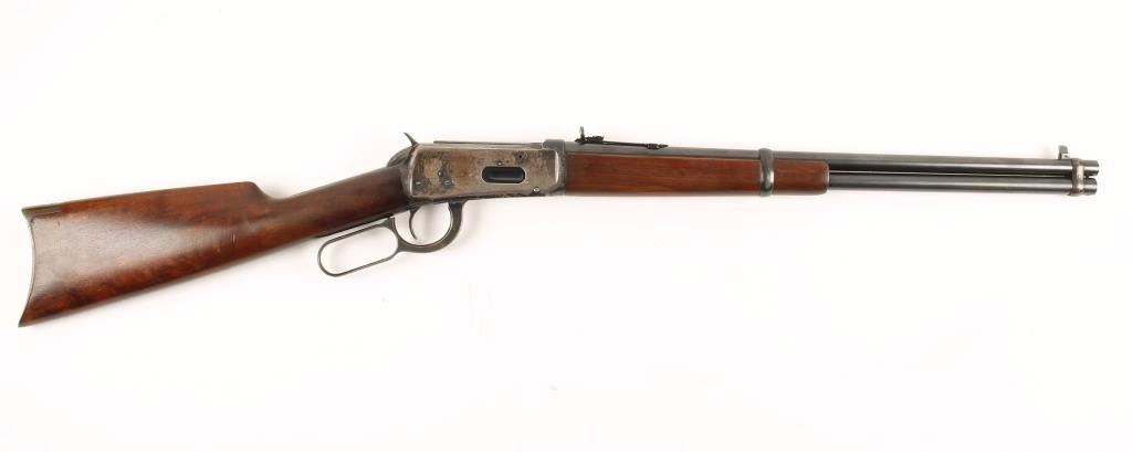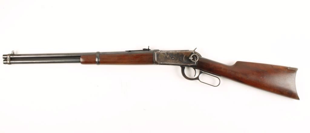 Lever action tube-fed repeating rifle chambered in .30 Winchester Center Fire, circa 1927. Features a fully blued finish, 20" tapered barrel, full magazine tube, blade front sight, adjustable buckhorn rear sight, saddle ring, checkered hammer spur, crescent buttplate, plain walnut forearm and straight grip shoulder stock. Blued finish on barrels show slight wear as with the magazine tube with 85%+ original finish retained. Receiver retains 40% finish with a mix of in-the-white and brown patina. Action is smooth, bore is very good and wood stock is very good+. Condition is good++. ***C&R Firearm*** ***Modern Firearm***
