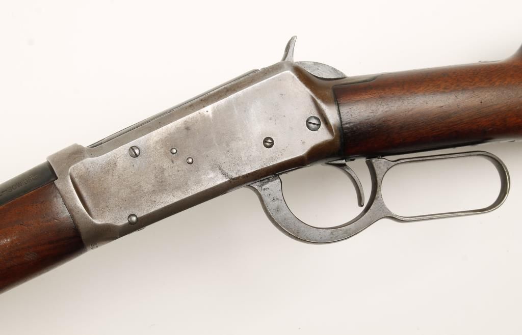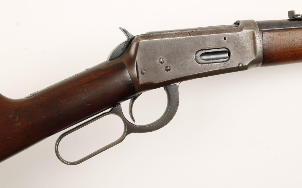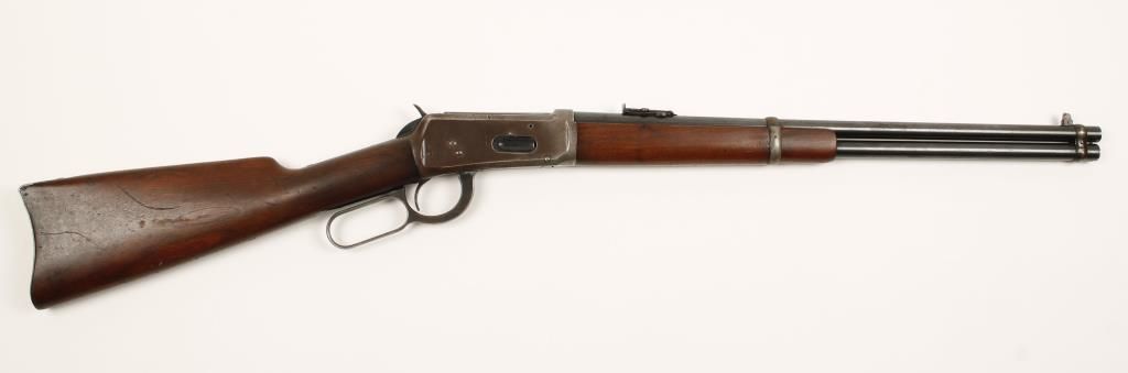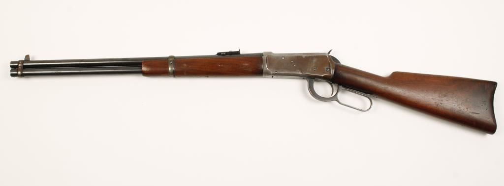 Vintage lever action Eastern carbine made in 1929 with 20" barrel. Blued finish, plain straight grip walnut stock and forend, full length tube magazine, carbine post front sight, flip up ladder rear sight and no saddle ring. Good clean bore and action is sticky. Condition: Very good showing brown patina on receiver, wood to metal fit is excellent. *Curio & Relic Firearm*
