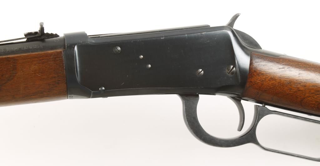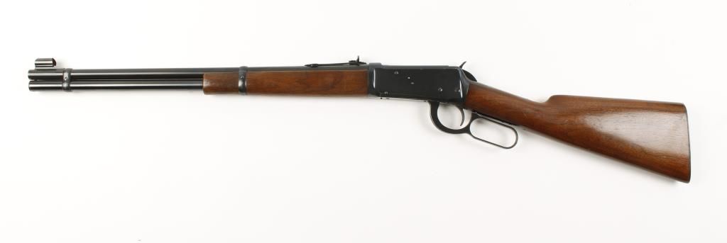 Lever action carbine made in 1942 with 20" barrel. Blued finish, plain straight grip walnut stock, full length tube magazine, grooved steel butt plate and hooded front sight. Right side of butt stock marked "NWPC". Very good bore and action. Condition: Very good showing small spot of bluing wear above trigger and wood is very good. *Curio & Relic Firearm*