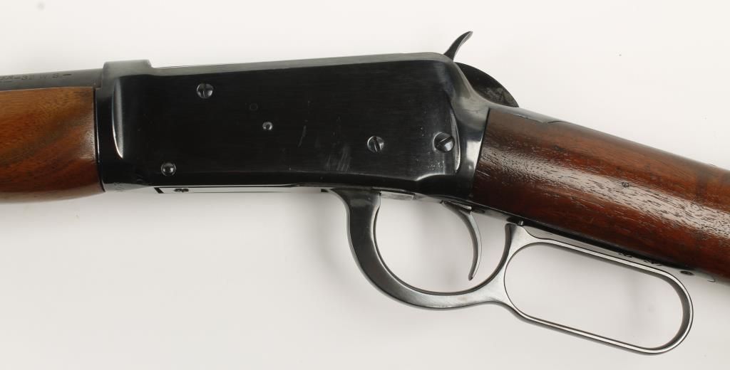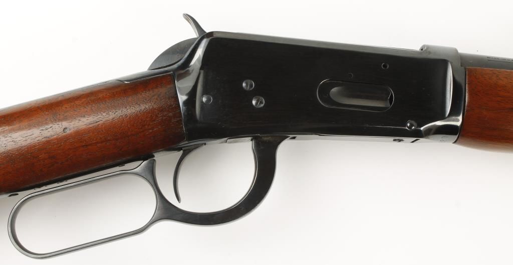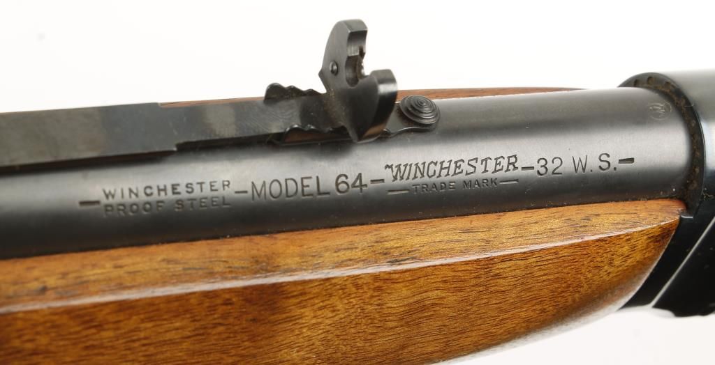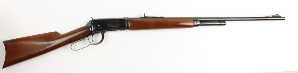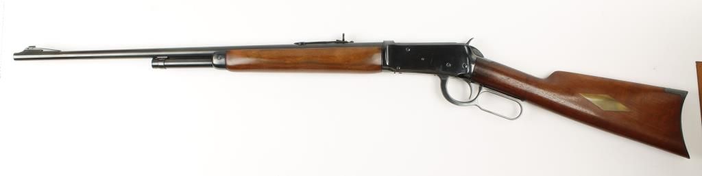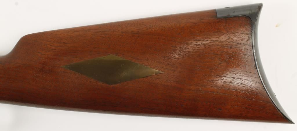 Lever action rifle made in 1894 rebarreled with a model 64 barrel 24" long. Blued refinished, straight grip plain walnut stock, semi beaver tail capped forearm, blued crescent butt plate and half length tube magazine. Stock has large brass diamond plates on each side. Good bore and action. Condition: Very good as refinished.