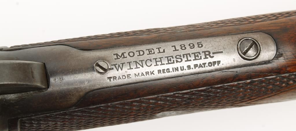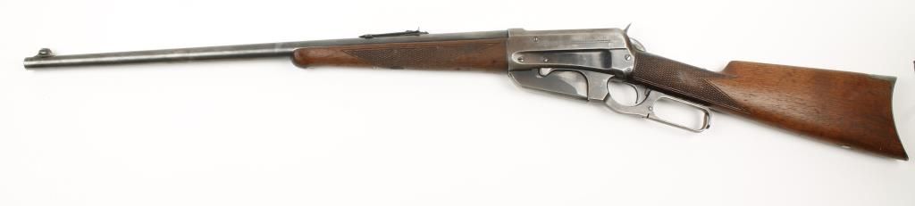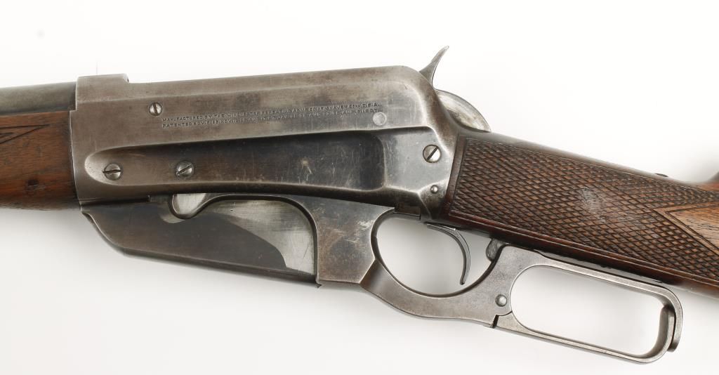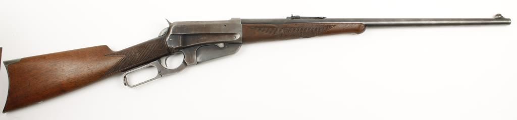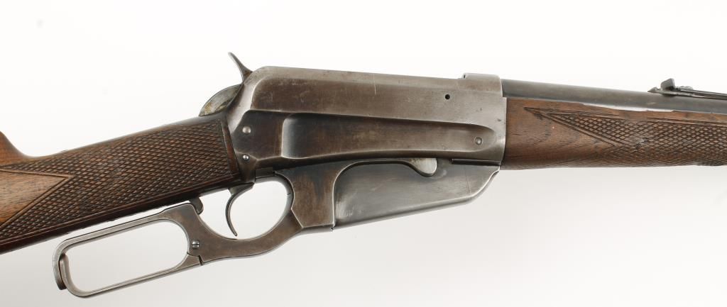 Lever action rifle made in 1912 with 24" barrel. Blued finish, checkered straight grip walnut stock and forearm, crescent butt plate and open sights. Good bore and action. Condition: Good showing 50% bluing remaining and wood is good showing light scratching and bruising.
