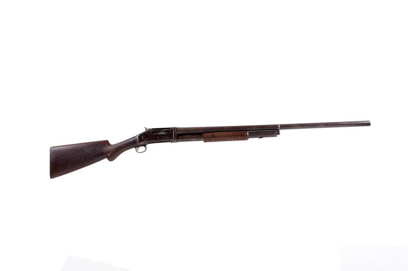 ConNice pump action shotgun with exposed hammer. Blued finish, smooth wood semi pistol grip stock with steel butt plate and round knob pistol grip, grooved pump handle, 30" barrel with full choke, good bore and action.Condition: Good with blue turning a nice soft brown, wood shows use but no abuse and not cracks or splits.