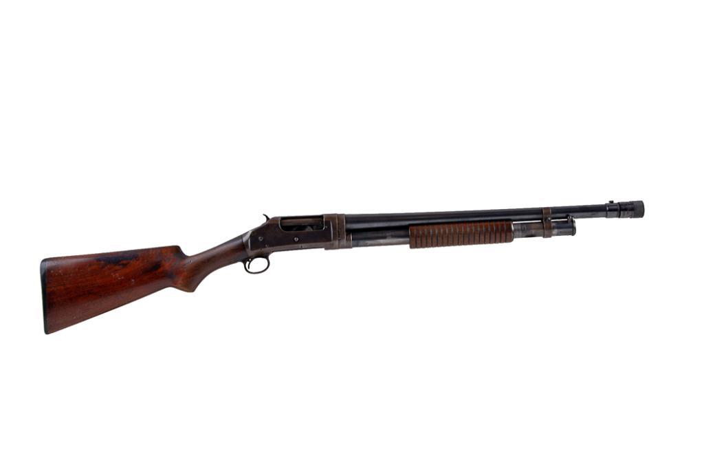CPump action take down shotgun with exposed hammer. Blued finish, walnut smooth semi pistol grip stock with hard plastic butt plate, and with grooved pump handle, 19" barrel with Poly Choke added, good bore and action.Condition: Very good with most blue still intact on the barrel, receiver turning mostly brown, wood is solid with some staining from use and AL carved his initials at the wrist.