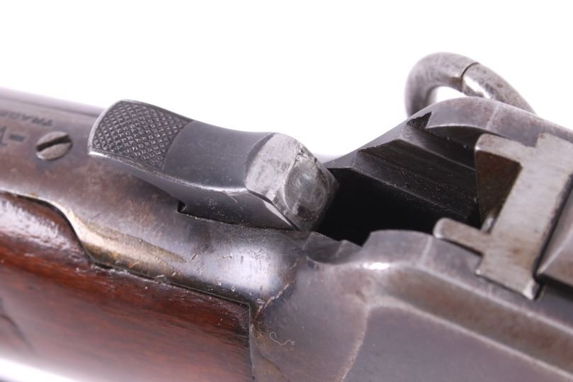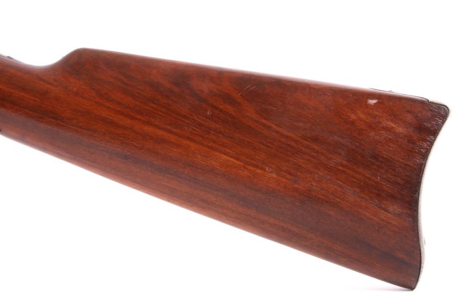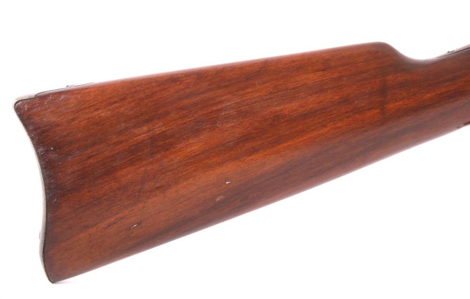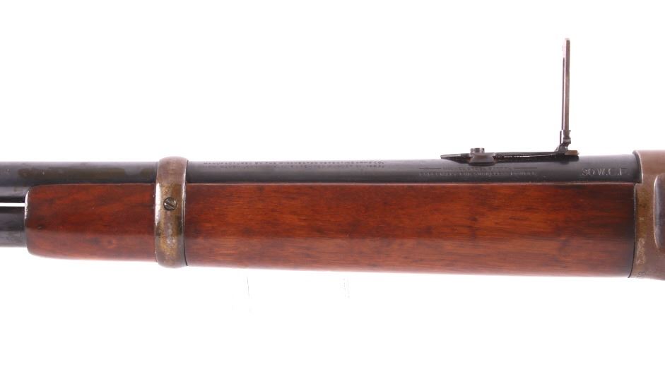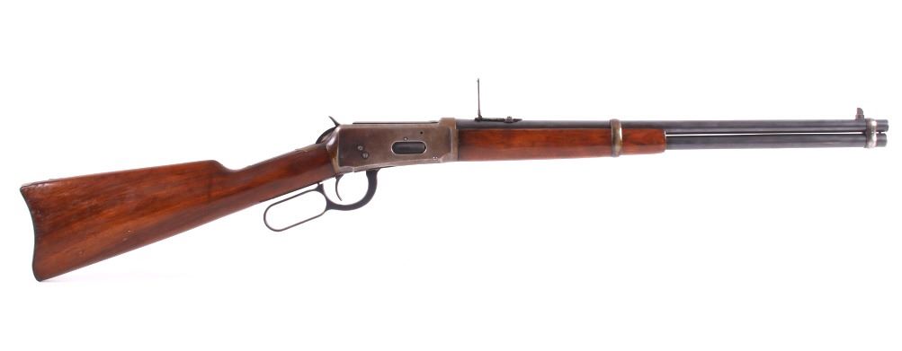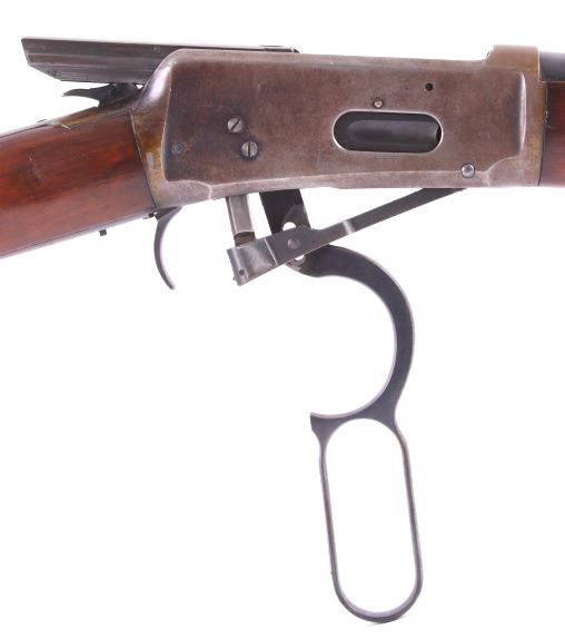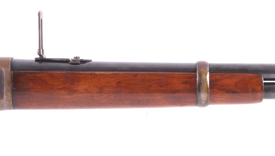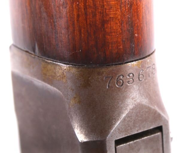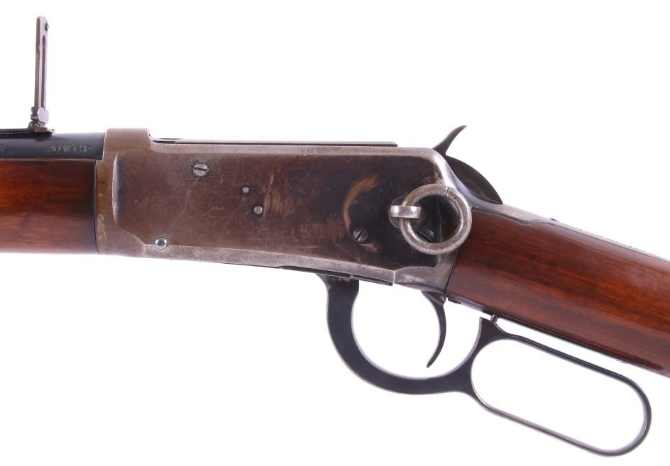 For auction in this lot is a Winchester Model 1894 Saddle Ring Carbine, chambered in .30 Winchester Center Fire (.30-30 WCF). The John Browning designed Winchester 94 repeating carbine was popular far and wide, from Klondike gold seekers, Texas Rangers, cowboys, ranchers, big game hunters, and Mexican Revolutionaries alike. The famous design of this 103 year old firearm stands the test of time, retaining a tight action, lock-up, and strong springs. The carbine utilizes a walnut butt-stock and fore-grip, showing a steel crescent butt-plate, 20" round barrel with full tube magazine, original Winchester blade front sight, and a folding leaf "Express" rear barrel sight. The carbine is marked in numerous spots, including: "Model 1894 -Winchester- Trade Mark" on the upper tang, Serial Number: "763678" on the bottom of the receiver, in front of the action, "-Nickel Steel Barrel- Especially for smokeless powder - 30W.C.F." on the left side of the barrel, and "Manufactured by the Winchester Repeating Arms CO. - New Haven, CONN. U.S.A Patented August 21. 1894" on top of the barrel, in front of the rear sight. This iconic rifle originates from the turbulent days of the Frontier, and was manufactured in 1915. Overall, the carbine shows good condition, retaining good blueing on the barrel, and receiver, while the walnut parts show typical handling marks free of cracking, and displaying tight metal to wood contact. The bore is in good condition for age, showing some darkness. Manufactured in 1915, the carbine qualifies as a Curio & Relic Long Gun, and REQUIRES FFL Transfer or NICS Background Check. Serial Number: 763678.
