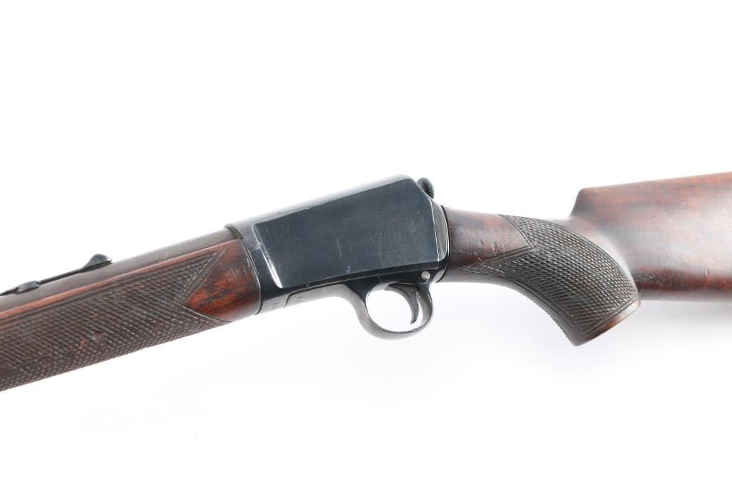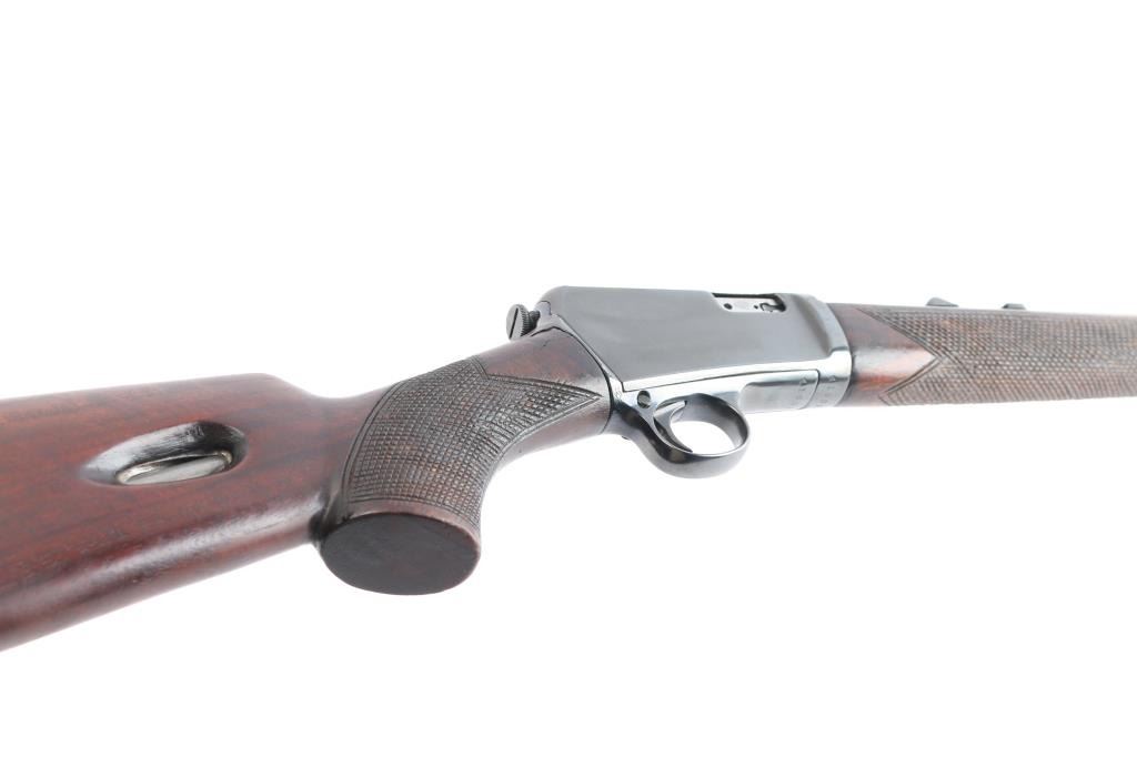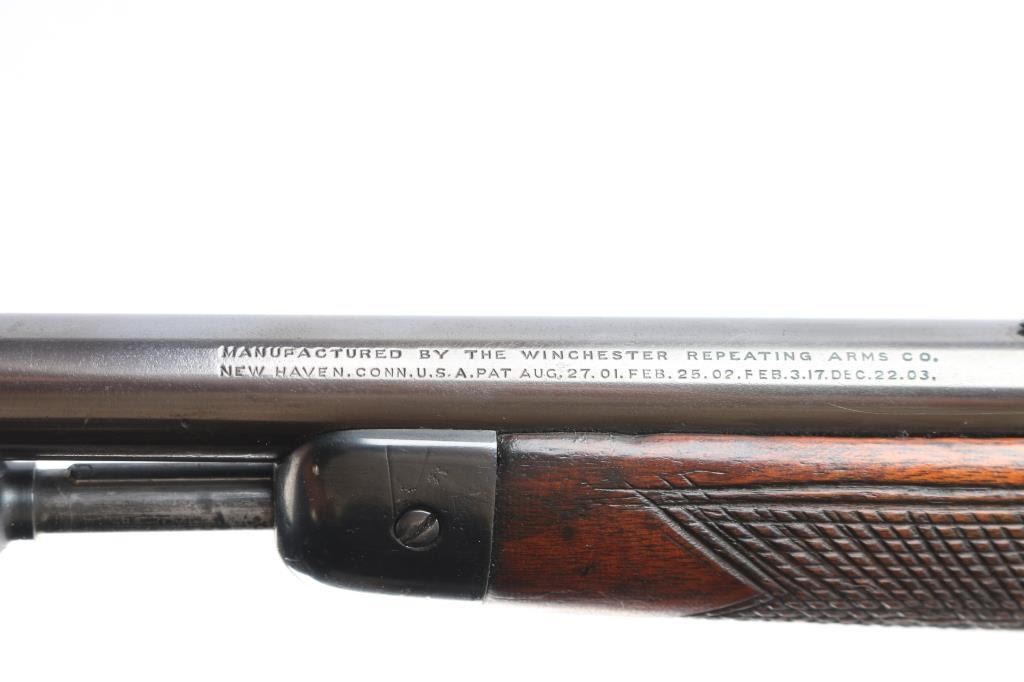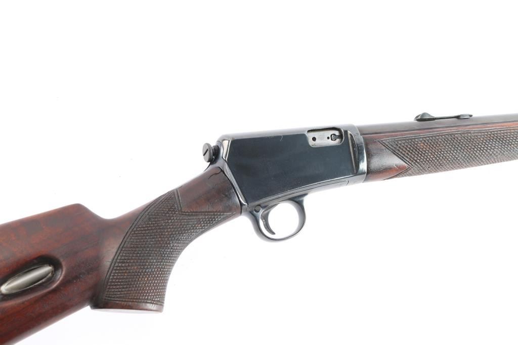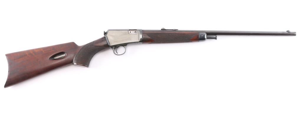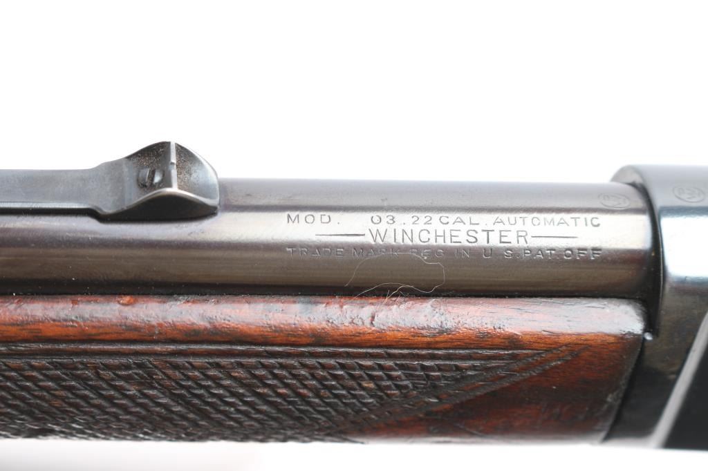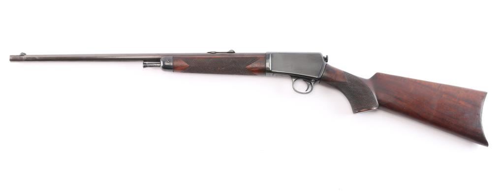 Winchester's first commercially available semi-automatic rifle. It was introduced in 1903. Vintage semiautomatic rimfire rifle, first year of production, manufactured circa 1903. Features reblued finish, wood forend with steel nose cap, wood butt with checkered pistol grip, steel semi-crescent buttplate, 20" barrel, dovetailed blade front sight, adjustable rear sight, magazine tube in butt, manual safety, takedown screw at receiver rear. Rod in forearm, plunge to charge. Bore has rifling present with scattered patches of light pitting. Metal surfaces show scattered light pitting under the reblued finish. Markings are clear. Numbers on receiver & trigger group match. Wood is overall very good, with a couple of light dents. Action is smooth.