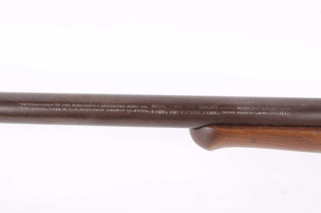 This lot gives you the option to bid on a Winchester Model 1904 single shot rifle, chambered in .22 short, long, and extra long. The rifle features a walnut stock, with a metal crescent butt-plate, blue'd 21" round barrel, and a manual firing pin, with a knurled texture. The upper-left side of the barrel reads; "Manufactured by the Winchester Repeating Arms CO. - New Haven, CONN. U.S.A. Patented August 29. 1899 - MOD. 04-22 Short - Long - OR Extra Long - Winchester - Trade Mark REG. In U.S. PAT. OFF.". Additionally, the barrel and the bolt are stamped with the Winchester house proof. The roll-stamping on the rifle attributes it to around 1919. Overall, the rifle is in good condition with 80% + blue finish remaining. The bore shows slight darkness, with light rifling. This firearm requires NICS background check, or FFL transfer. Domestic Model 1904's were sold without a serial number.