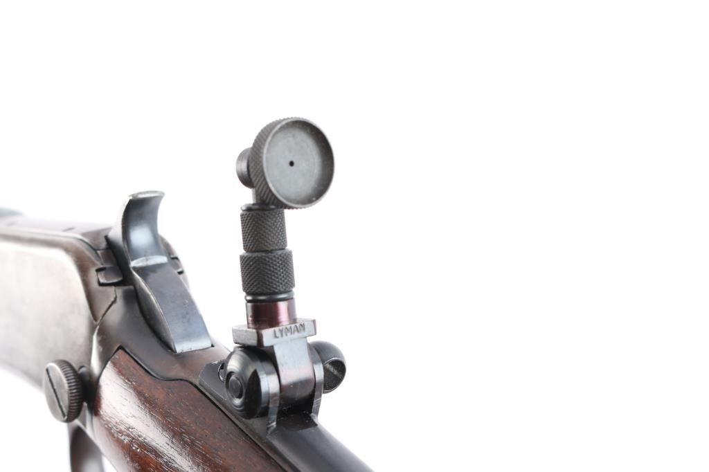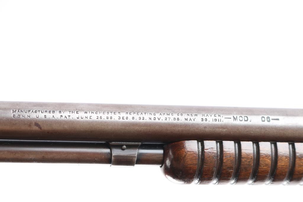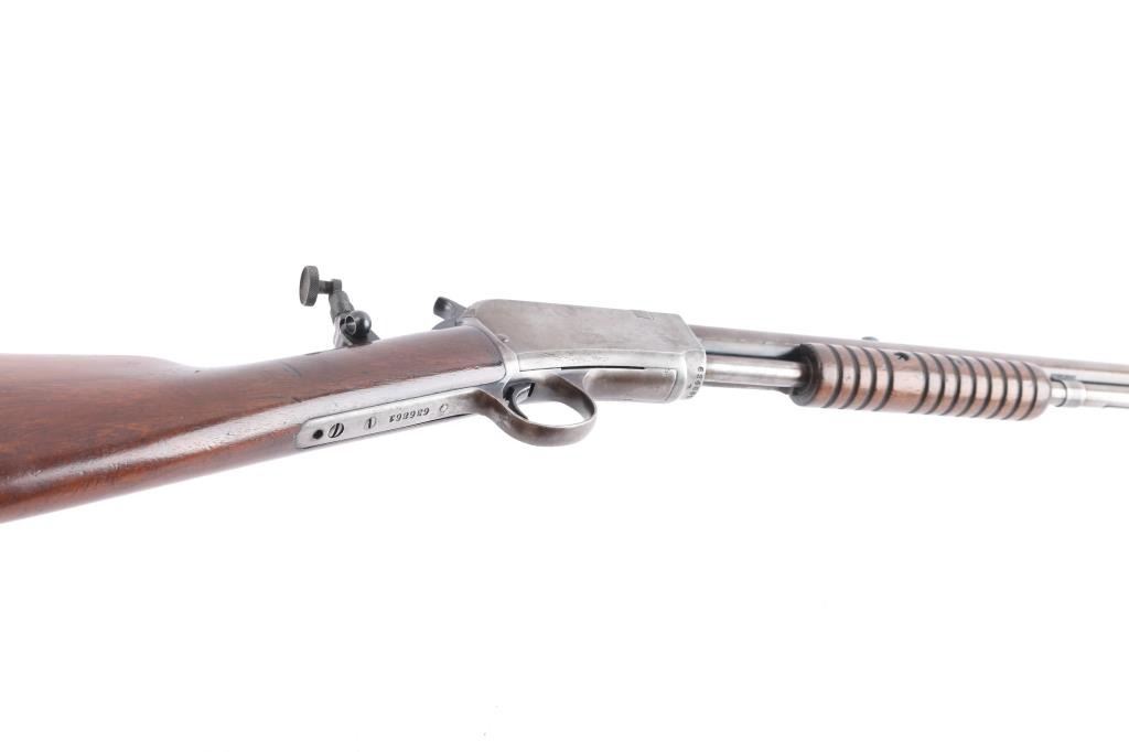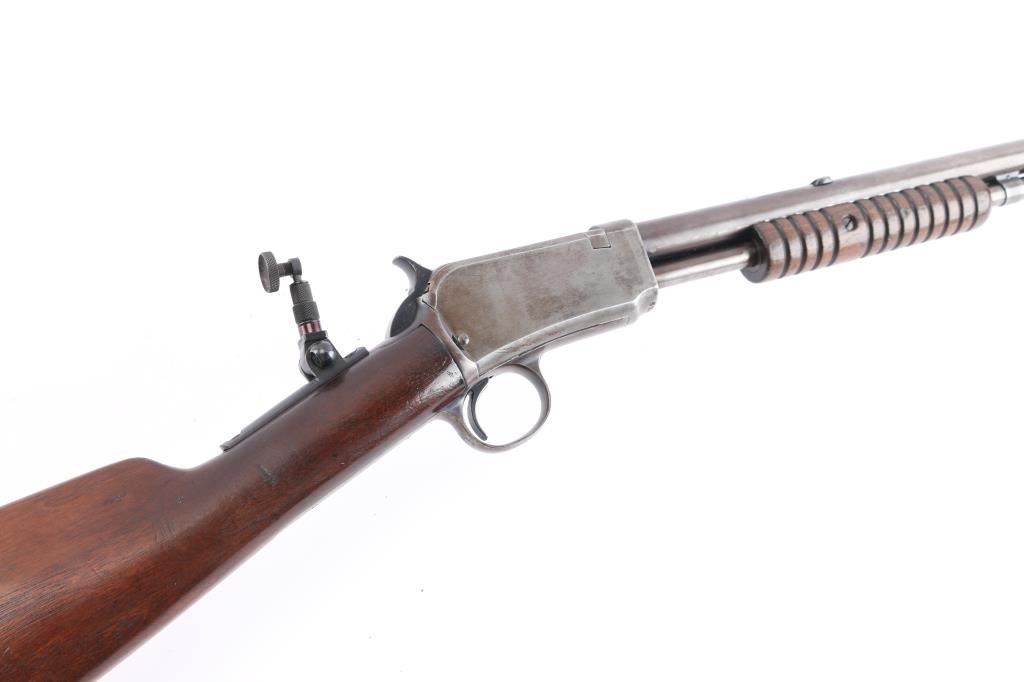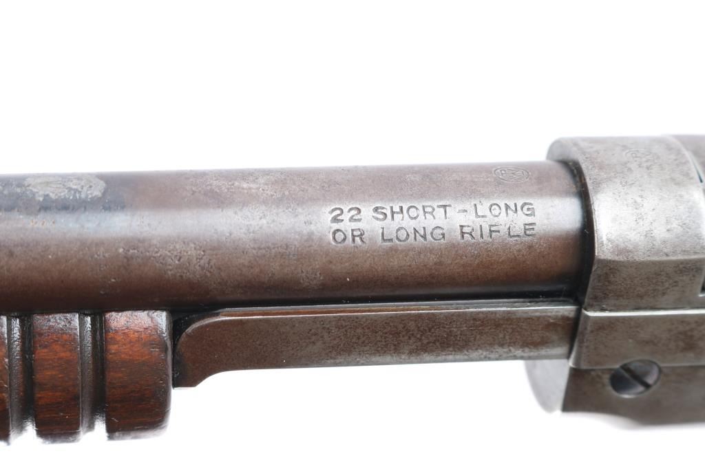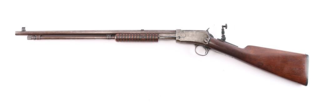 Vintage take-down slide action repeating rifle chambered for .22 Short, Long or Long Rifle, manufactured 1906-1932. This one in 1925. Features a blued finish, 20" round barrel, near full-length 11 round magazine tube, dovetailed blade/bead front sight, rear sight removed with steel insert in dovetail, tang mounted Lyman # No 2 peep sight installed, smooth trigger, knurled hammer spur, take-down steel receiver, grooved wood slide handle, and smooth walnut straight grip shoulder stock with hard rubber Winchester buttplate. Matching serial numbers are found on the receiver and lower tang. Rifle retains approximately 10% of its blued finish, mostly turning a brown patina, traces of blue in recessed areas. Receiver is mostly in the white from handling. Slide action is sound, the bore is very good, strong rifling and the wood stocks are very good/sound with minor scratches/dings.