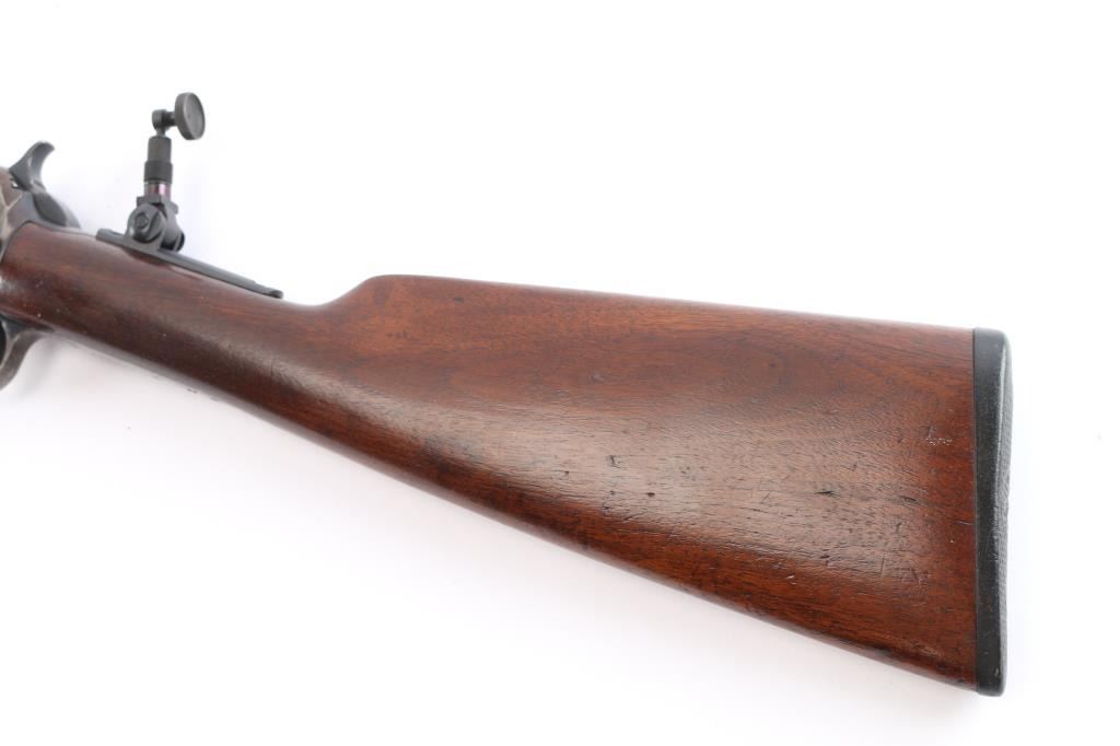 GOOD: Some minor replacement parts; metal smoothly rusted or lightly pitted in places, cleaned or re-blued; principal letters, numerals and design on metal legible; wood refinished, scratched bruised or minor cracks repaired; in good working order.