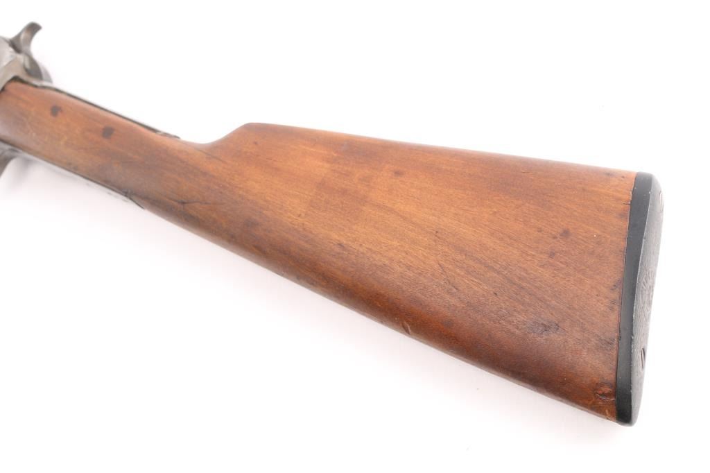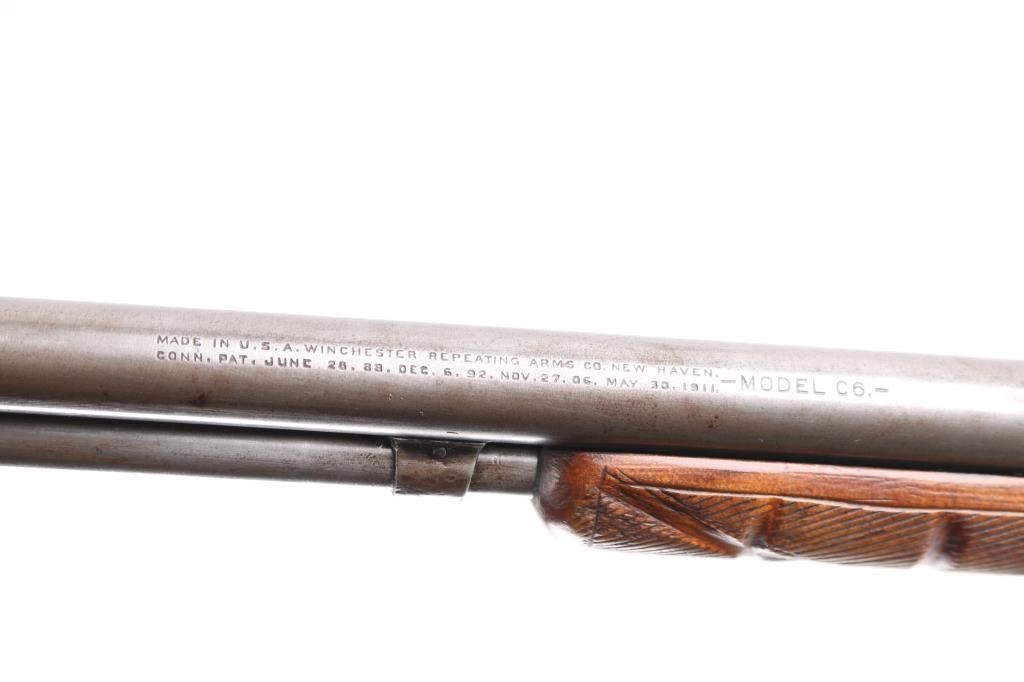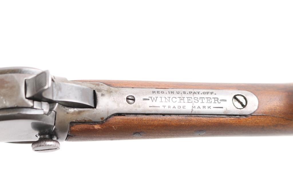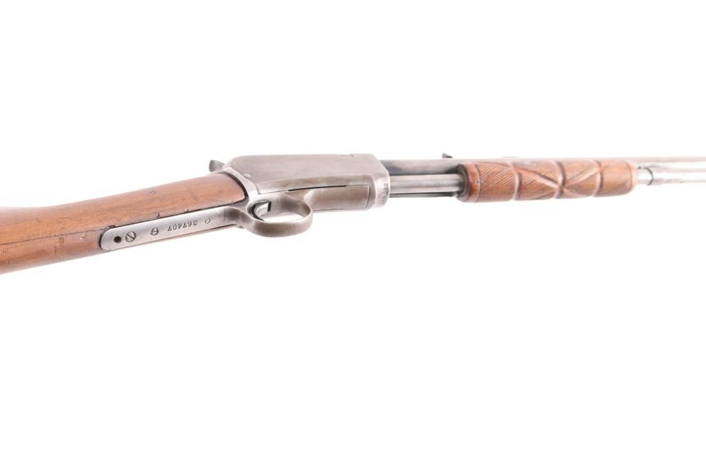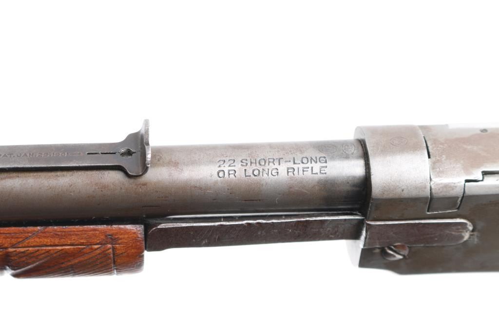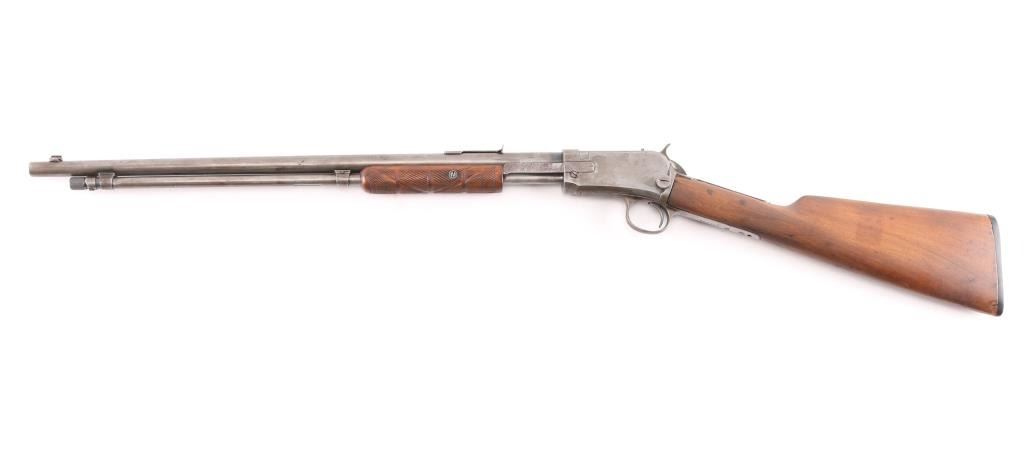 Pump action rimfire rifle manufactured circa 1912. Features blued finish, smooth wood pump handle, wood butt with straight grip area, factory composition buttplate, 20" round barrel, blade front sight with bead top, adjustable rear sight, magazine tube under barrel, external hammer, take down screw in receiver. Bore is excellent/bright. Finish has turned to patina gray/brown, with edge losses and other losses. slide action is smooth. Wood is good condition with shrinkage around tangs, sanded & varnished, minor scratches, the pump handle has been hand checkered. lower tang number matches receiver. Markings generally readable.