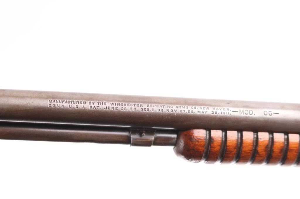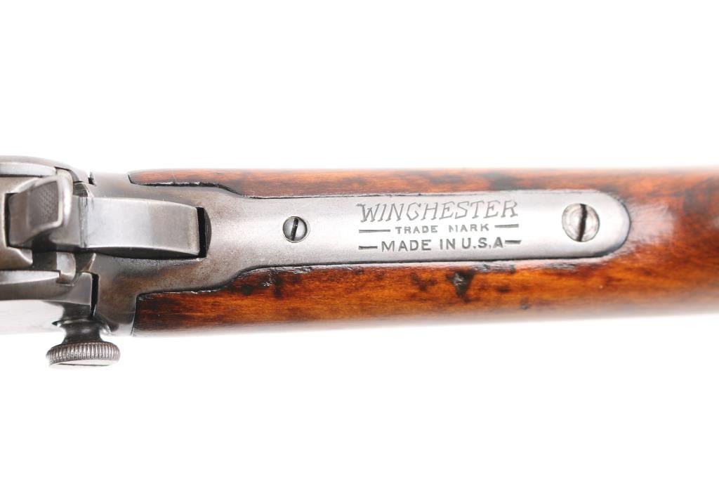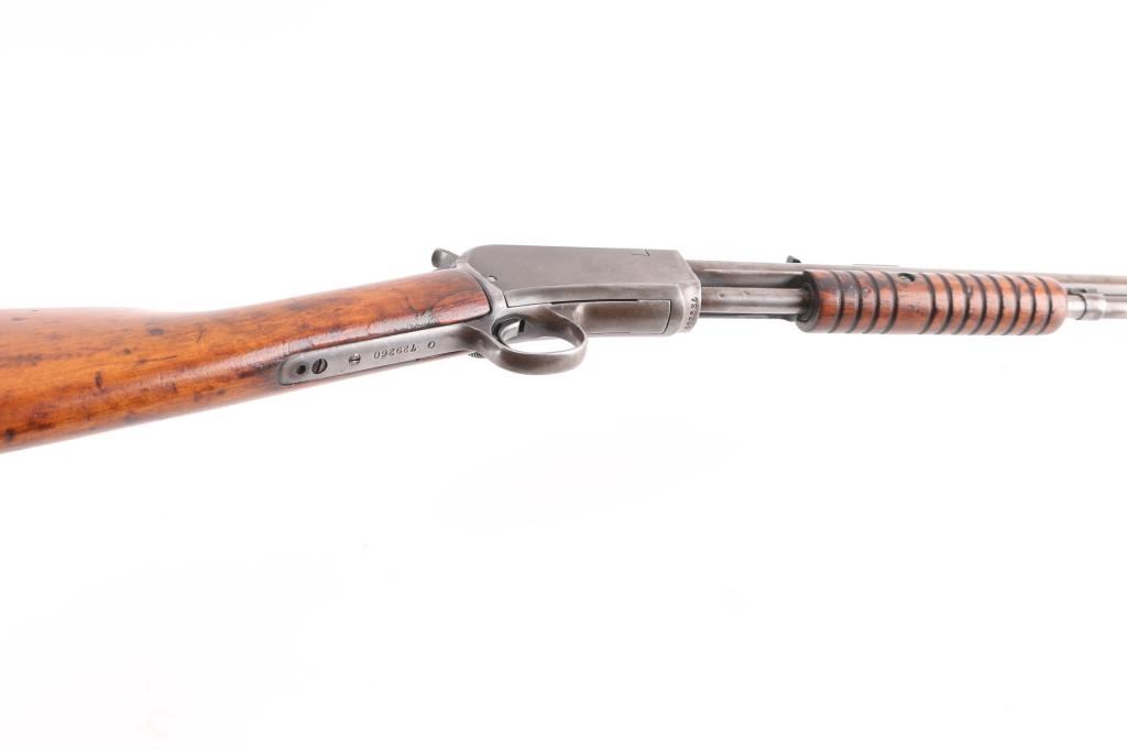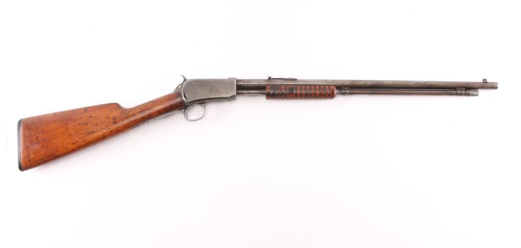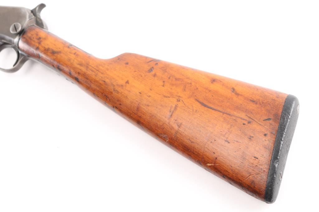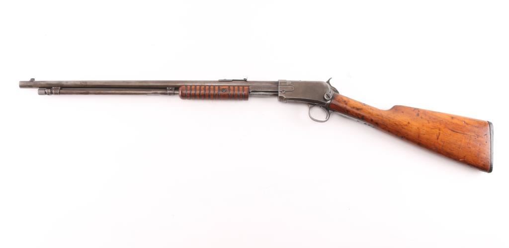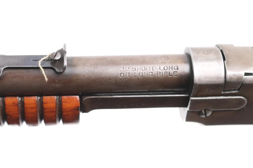 Vintage pump action rimfire rifle manufactured circa 1932, last year of production. Features 20" round barrel, dovetailed blade front & adjustable rear sights, magazine tube under barrel, exposed hammer, grooved walnut pump handle, smooth walnut shoulder stock, factory black hard rubber buttplate, take down screw on receiver left side. Bore is good/bright condition, visible rifling with some very light pitting. blue finish has mostly turned a gray/brown patina with only traces od blur in protected areas. Wood is sound with many small dents/scratches, have been lightly sanded and refinished. Action is smooth. Matching serial numbers.
