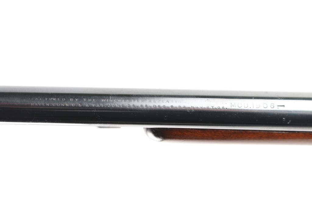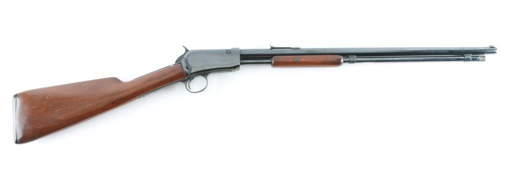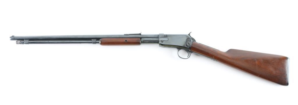 Pump action rimfire rifle manufactured circa 1907. Features 19" round barrel, dovetailed blade front & adjustable rear sights, full length magazine tube under barrel, exposed hammer, smooth walnut pump handle, smooth walnut shoulder stock, factory black hard rubber buttplate, take down screw on receiver left side. Bore is fair condition, visible rifling with dark appearance, might improve with cleaning. Retains 90% reblue, with eroded or shallow markings, rounded corners from heavy buffing, some pits and other blemishes retained under the re-finish. Mag tube is a bit loose. Wood is good overall, stock has been sanded with significant erosion at tangs. Buttplate shape altered to blend to stock profile. Condition is NRA Good (refinished) *** C&R Firearm ***