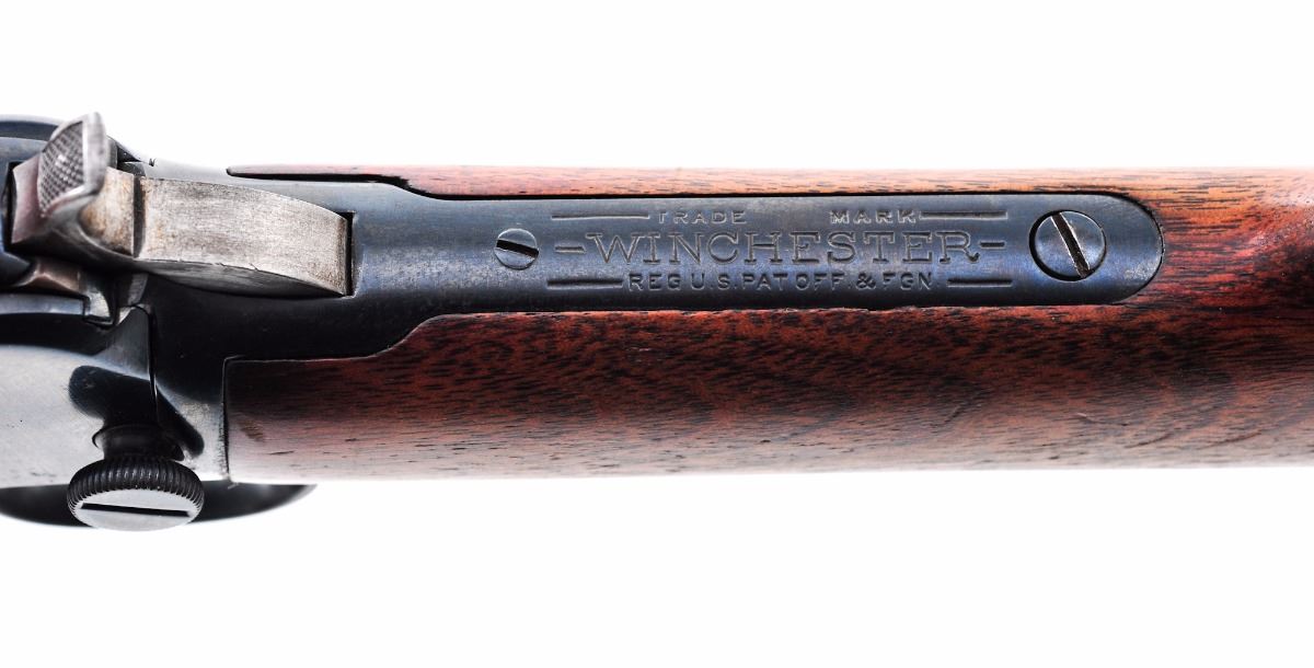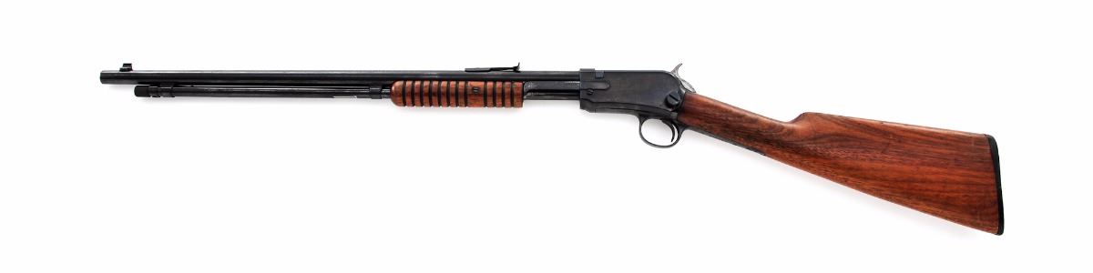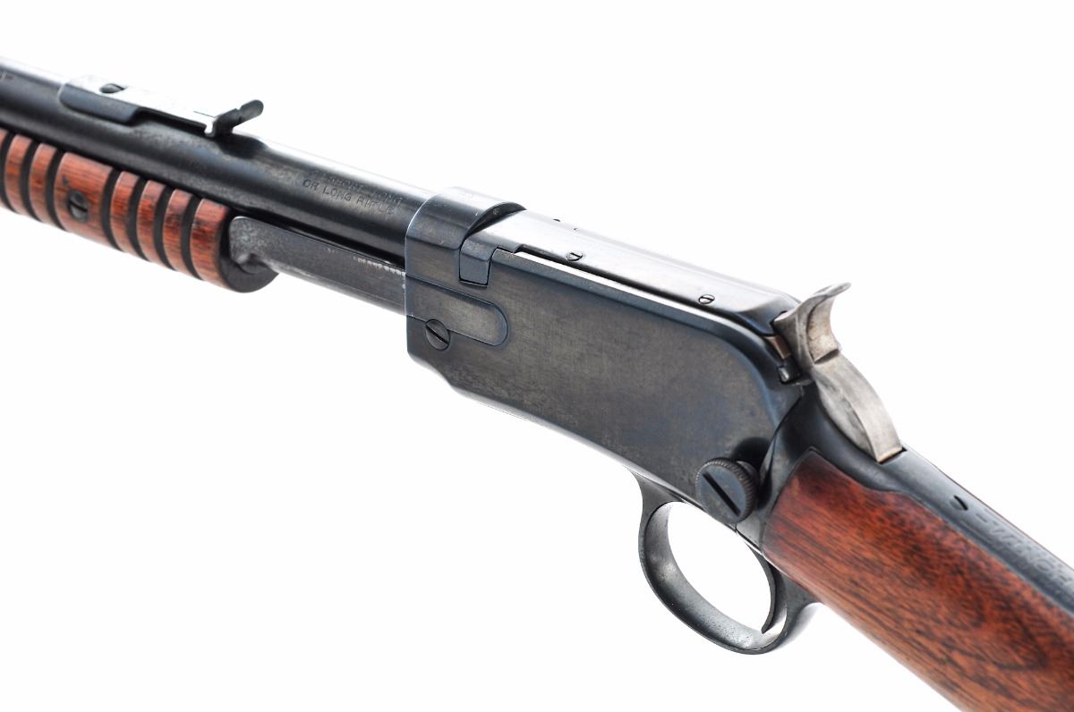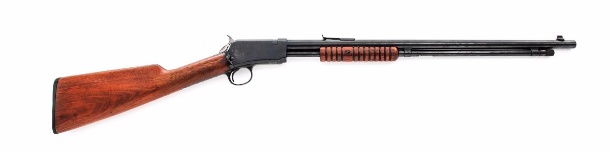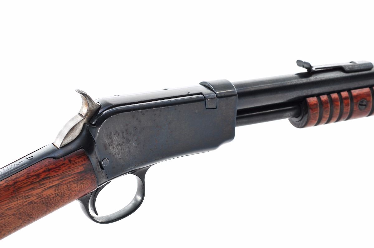 Winchester Model 06 Slide Action Rifle, #657990, .22 S-L-LR cal., 20'' barrel, blue finish, two-piece walnut stock, blade front sight and leaf rear sight. Condition is good as refinished with even light freckling overall. Stock is in very good condition with light pressure dents and a few light surface scratches. Action is tight, bore is bright. Est.: $250-$350. (C&R)