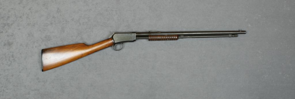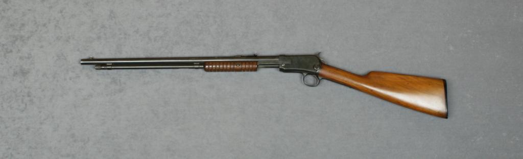 Winchester Model 06 pump action rifle, .22 short, long or long rifle cal., 20” round barrel, blue finish, wood stocks, #392828. This gun is in overall good condition showing approx. 95% of an old re-blue finish, goodbore and action, overall good wood with butt stock re-finished. Est.: $250-$500.