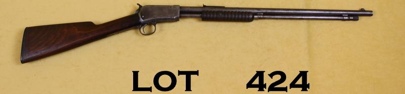Winchester Model 06 semi-auto rifle, .22 short, long and long rifle cal., 20” round barrel, patina finish, wood stocks, #638847B. This gun is in overall fair to good condition showing an even grey patina finish to metal surfaces, fair bore, good action and markings, overall good wood stocks with scattered wear, nicks and scratches; replaced hard rubber butt plate. Est.: $200-$400.