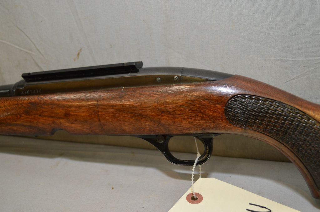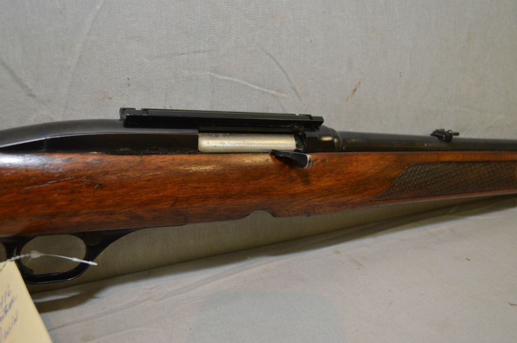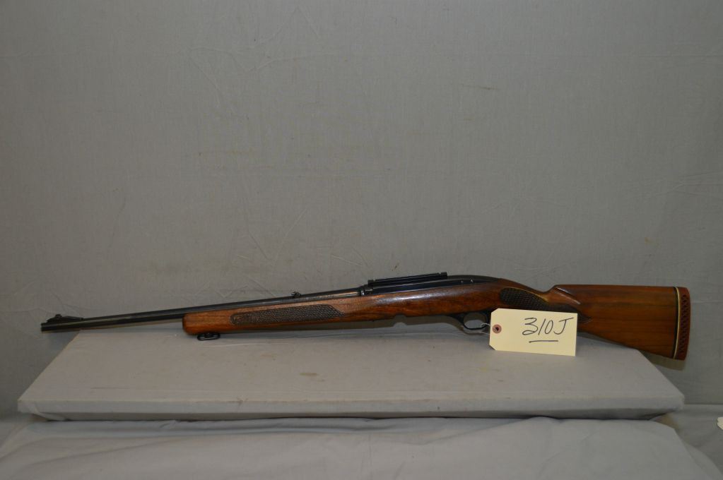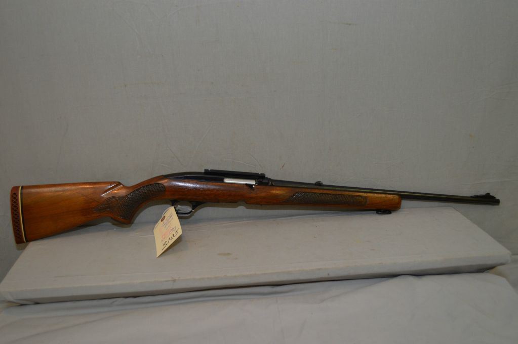 Winchester Model 100 .284 Win Cal Mag Fed Semi Auto Rifle w/ 22" bbl [ good blued finish, barrel sights, w/scope base, basket weave & oak leaf patterned checkered pistol grip stock & forend w/ Winchester recoil pad , missing back swivel & mag ] Ser # A187416